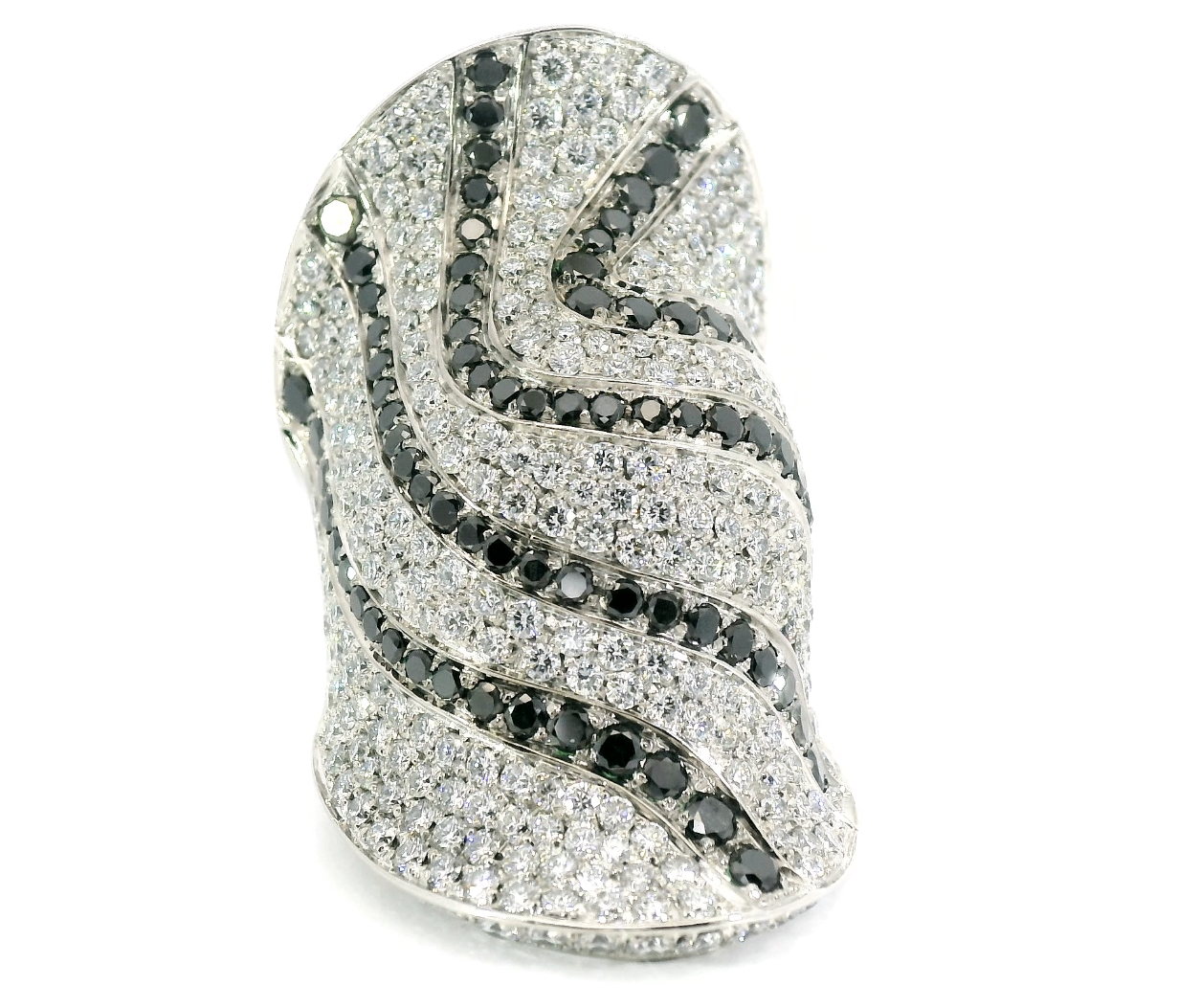 Оригинальное золотое кольцо с бриллиантами 7.34ct Palmiero — настоящее произведение искусства, в котором воплощено не только мастерство ювелира, но и актуальные тренды. Это доказательство вашего изысканного вкуса, высокого статуса и яркий акцент в стильном образе. Вставка — 309 бриллиантов круглой огранки 5.19ct 2/2-3/3, 81 черный бриллиант круглой огранки 2.15ct 7/9, а обрамлением служит золото 750 пробы. Такое сочетание отлично смотрится и позволяет реализовывать самые необычные задумки вашего стиля. Размер ювелирного изделия — 18, а общий вес — 29.73 г, и на пальце оно выглядит просто шикарно, сразу привлекая восхищенное внимание.