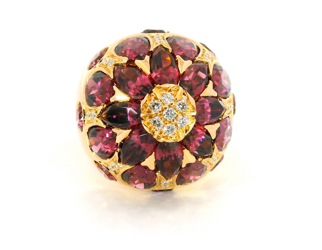 Оригинальное золотое кольцо с гранатами 17.20ct Giovanni Ferraris — настоящее произведение искусства, в котором воплощено не только мастерство ювелира, но и актуальные тренды. Это доказательство вашего изысканного вкуса, высокого статуса и яркий акцент в стильном образе. Вставка — 8 гранатов круглой огранки 4.00ct, 8 гранатов огранки "груша" 8.00ct, 8 гранатов огранки "маркиз" 5.20ct, 23 бриллианта круглой огранки 0.26ct 3/4, а обрамлением служит золото 750 пробы. Такое сочетание отлично смотрится и позволяет реализовывать самые необычные задумки вашего стиля. Размер ювелирного изделия — 18.5, бесплатно изменим на любой от 16.5 до 18.25, а общий вес — 21.95 г, и на пальце оно выглядит просто шикарно, сразу привлекая восхищенное внимание.