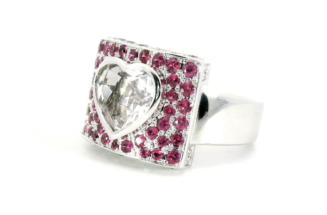 Оригинальное золотое кольцо с кварцем 1.44ct Avakian — настоящее произведение искусства, в котором воплощено не только мастерство ювелира, но и актуальные тренды. Это доказательство вашего изысканного вкуса, высокого статуса и яркий акцент в стильном образе. Вставка — 1 кварц огранки "сердце" 1.44ct, 18 бриллиантов круглой огранки 0.37ct 3/3-3/4, 40 рубинов круглой огранки 0.78ct, а обрамлением служит золото 750 пробы. Такое сочетание отлично смотрится и позволяет реализовывать самые необычные задумки вашего стиля. Размер ювелирного изделия — 16, бесплатно изменим на любой от 14 до 16.5, а общий вес — 10.69 г, и на пальце оно выглядит просто шикарно, сразу привлекая восхищенное внимание.