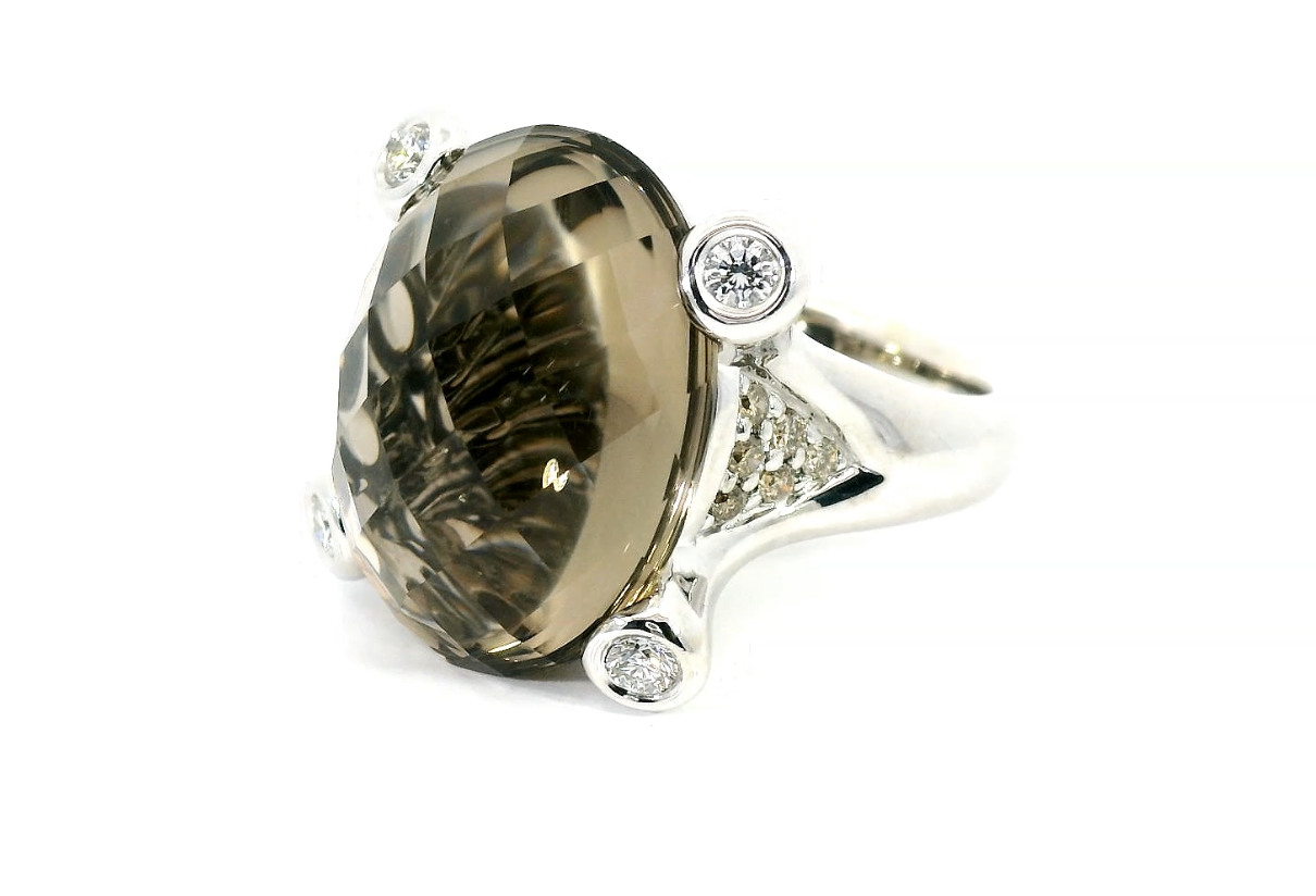 Оригинальное золотое кольцо с кварцем 17.91ct Belle Bague (GIM) — настоящее произведение искусства, в котором воплощено не только мастерство ювелира, но и актуальные тренды. Это доказательство вашего изысканного вкуса, высокого статуса и яркий акцент в стильном образе. Вставка — 1 дымчатый кварц огранки "фантазийный овал" 17.91ct, 30 бриллиантов круглой огранки 0.45ct 7/4, 4 бриллианта круглой огранки 0.24ct 3/3, а обрамлением служит золото 750 пробы. Такое сочетание отлично смотрится и позволяет реализовывать самые необычные задумки вашего стиля. Размер ювелирного изделия — 17.5, бесплатно изменим на любой от 17 до 18, а общий вес — 14.53 г, и на пальце оно выглядит просто шикарно, сразу привлекая восхищенное внимание.