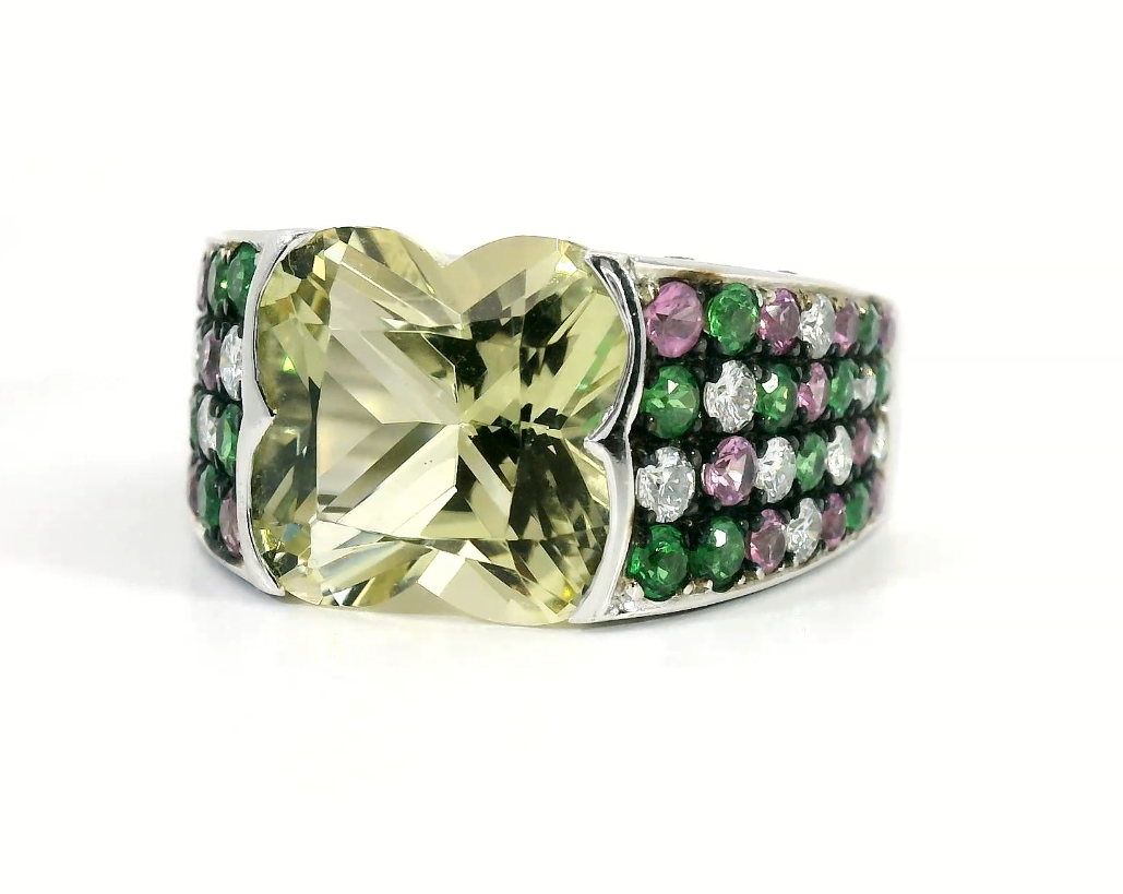 Оригинальное золотое кольцо с празиолитом 5.05ct Mauboussin — настоящее произведение искусства, в котором воплощено не только мастерство ювелира, но и актуальные тренды. Это доказательство вашего изысканного вкуса, высокого статуса и яркий акцент в стильном образе. Вставка — 1 празиолит фантазийной огранки 5.05ct, 34 рубина круглой огранки 1.02ct фиолетово-красный/3, 32 тсаворита круглой огранки 0.85ct, 30 бриллиантов круглой огранки 0.33ct 2/3-3/4, а обрамлением служит золото 750 пробы. Такое сочетание отлично смотрится и позволяет реализовывать самые необычные задумки вашего стиля. Размер ювелирного изделия — 17.25, а общий вес — 12.5 г, и на пальце оно выглядит просто шикарно, сразу привлекая восхищенное внимание.