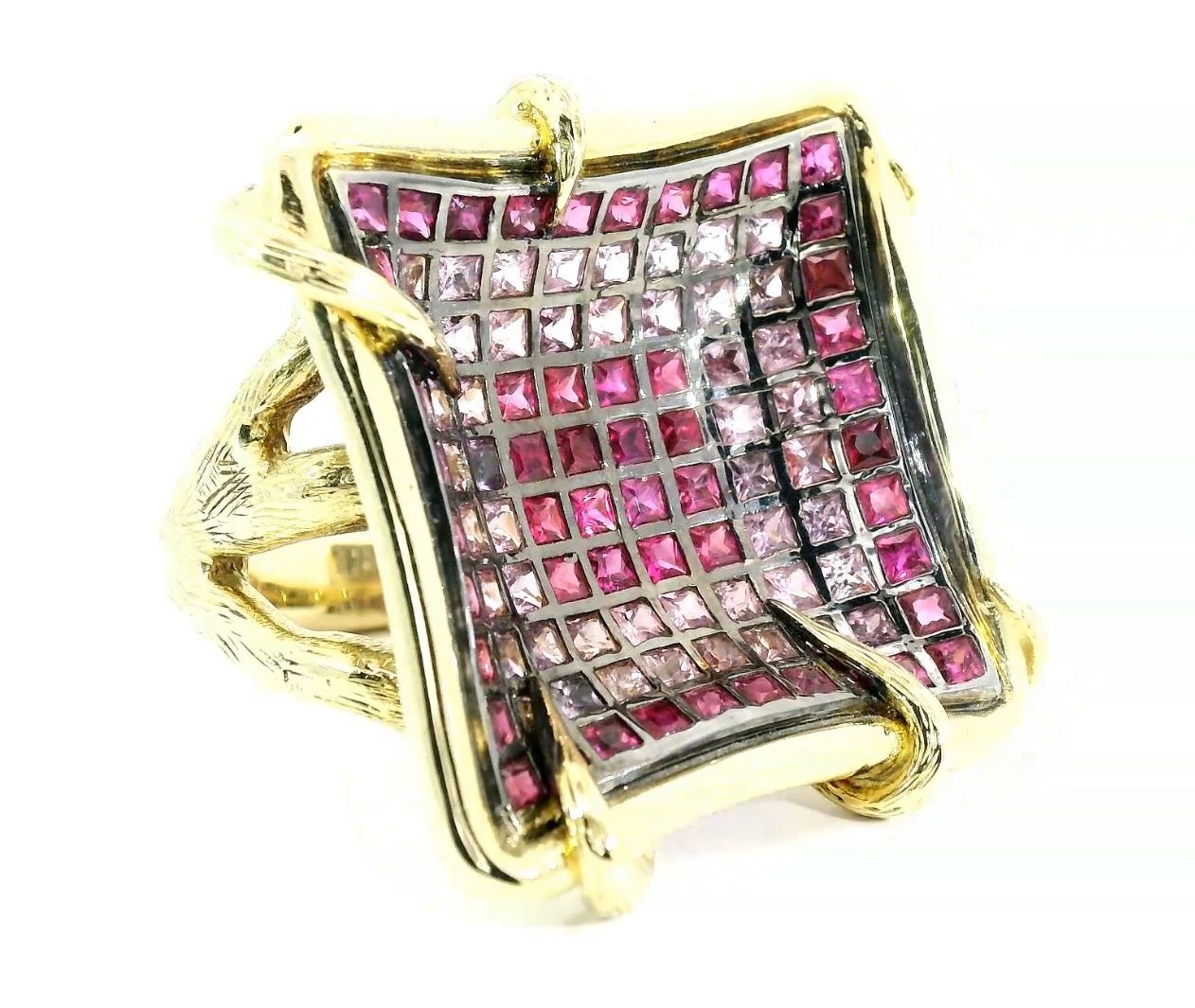 Оригинальное золотое кольцо с рубинами 3.12ct German Kabirski — настоящее произведение искусства, в котором воплощено не только мастерство ювелира, но и актуальные тренды. Это доказательство вашего изысканного вкуса, высокого статуса и яркий акцент в стильном образе. Вставка — 52 рубина квадратной огранки 3.12ct 3/2-4/3, 48 розовых сапфиров квадратной огранки 2.88ct, а обрамлением служит золото 585 пробы. Такое сочетание отлично смотрится и позволяет реализовывать самые необычные задумки вашего стиля. Размер ювелирного изделия — 17.5, бесплатно изменим на любой от 16.5 до 18.5, а общий вес — 33.91 г, и на пальце оно выглядит просто шикарно, сразу привлекая восхищенное внимание.
