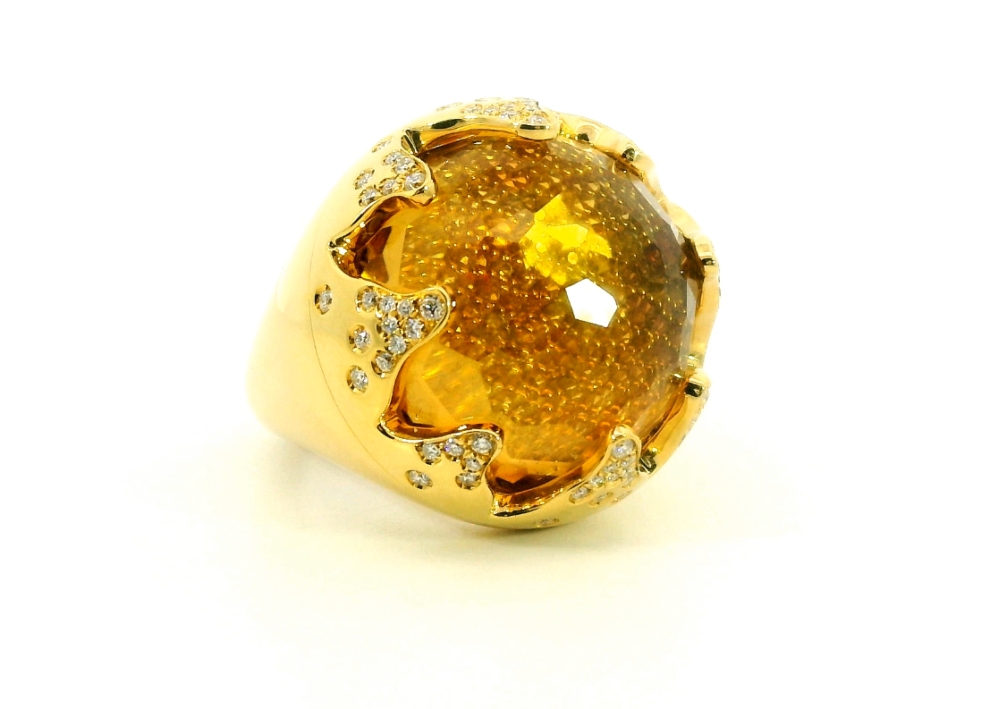 Оригинальное золотое кольцо с цитринами 30.10ct Pasquale Bruni SiSi — настоящее произведение искусства, в котором воплощено не только мастерство ювелира, но и актуальные тренды. Это доказательство вашего изысканного вкуса, высокого статуса и яркий акцент в стильном образе. Вставка — 1 цитрин огранки "круглый кабошон" 29.60ct, 69 бриллиантов круглой огранки 0.56ct 2/2-3/3, 101 цитрин круглой огранки 0.50ct, а обрамлением служит золото 750 пробы. Такое сочетание отлично смотрится и позволяет реализовывать самые необычные задумки вашего стиля. Размер ювелирного изделия — 17.5, бесплатно изменим на любой от 15.5 до 17.25, а общий вес — 36.54 г, и на пальце оно выглядит просто шикарно, сразу привлекая восхищенное внимание.