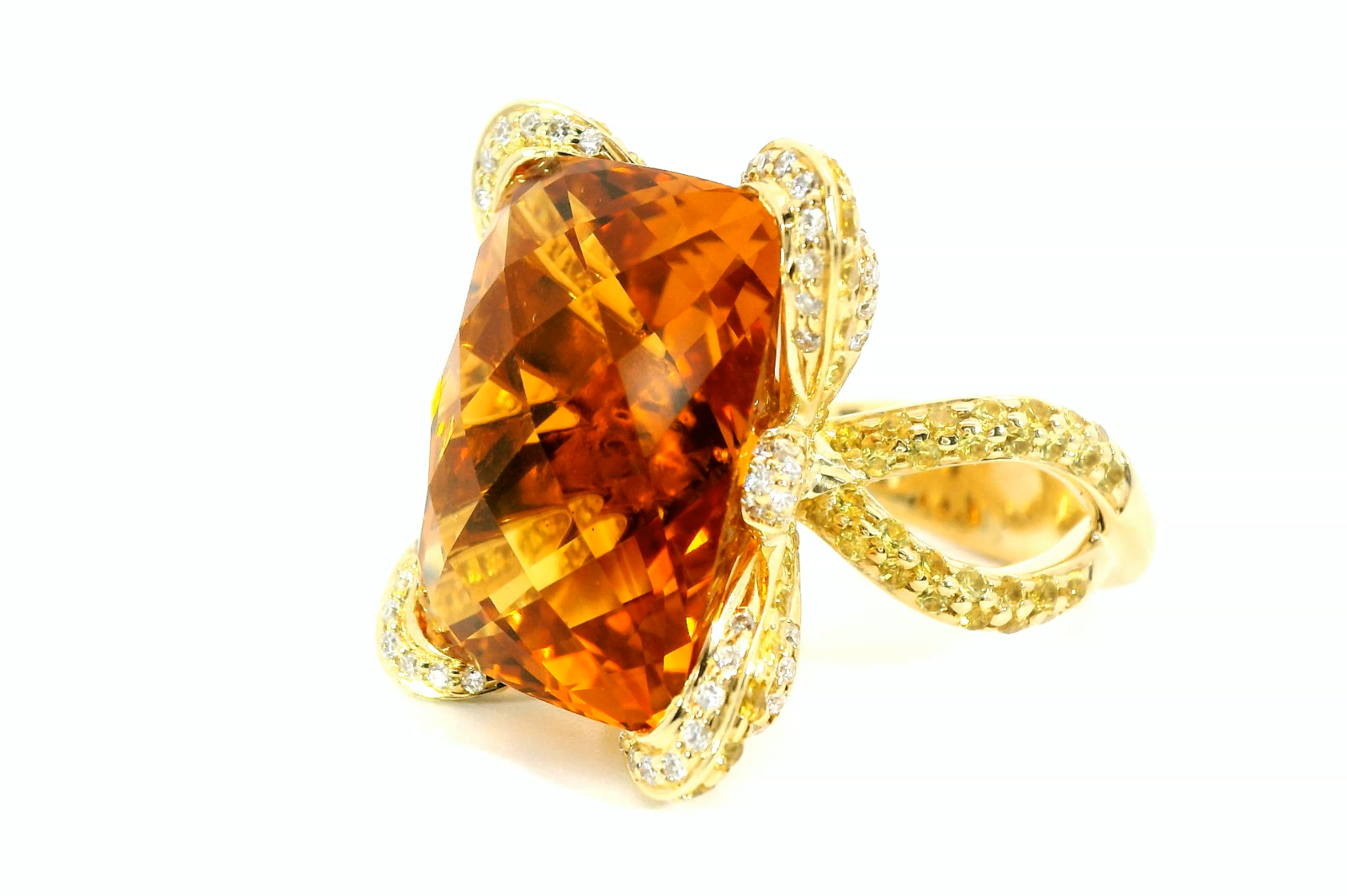 Оригинальное золотое кольцо с цитрином 18.53ct Belle Bague (GIM) — настоящее произведение искусства, в котором воплощено не только мастерство ювелира, но и актуальные тренды. Это доказательство вашего изысканного вкуса, высокого статуса и яркий акцент в стильном образе. Вставка — 1 цитрин огранки "фантазийный прямоугольник" 18.53ct, 56 желтых сапфиров круглой огранки 1.01ct, 164 бриллианта круглой огранки 0.76ct 3/3, а обрамлением служит золото 750 пробы. Такое сочетание отлично смотрится и позволяет реализовывать самые необычные задумки вашего стиля. Размер ювелирного изделия — 16.5, а общий вес — 20.21 г, и на пальце оно выглядит просто шикарно, сразу привлекая восхищенное внимание.