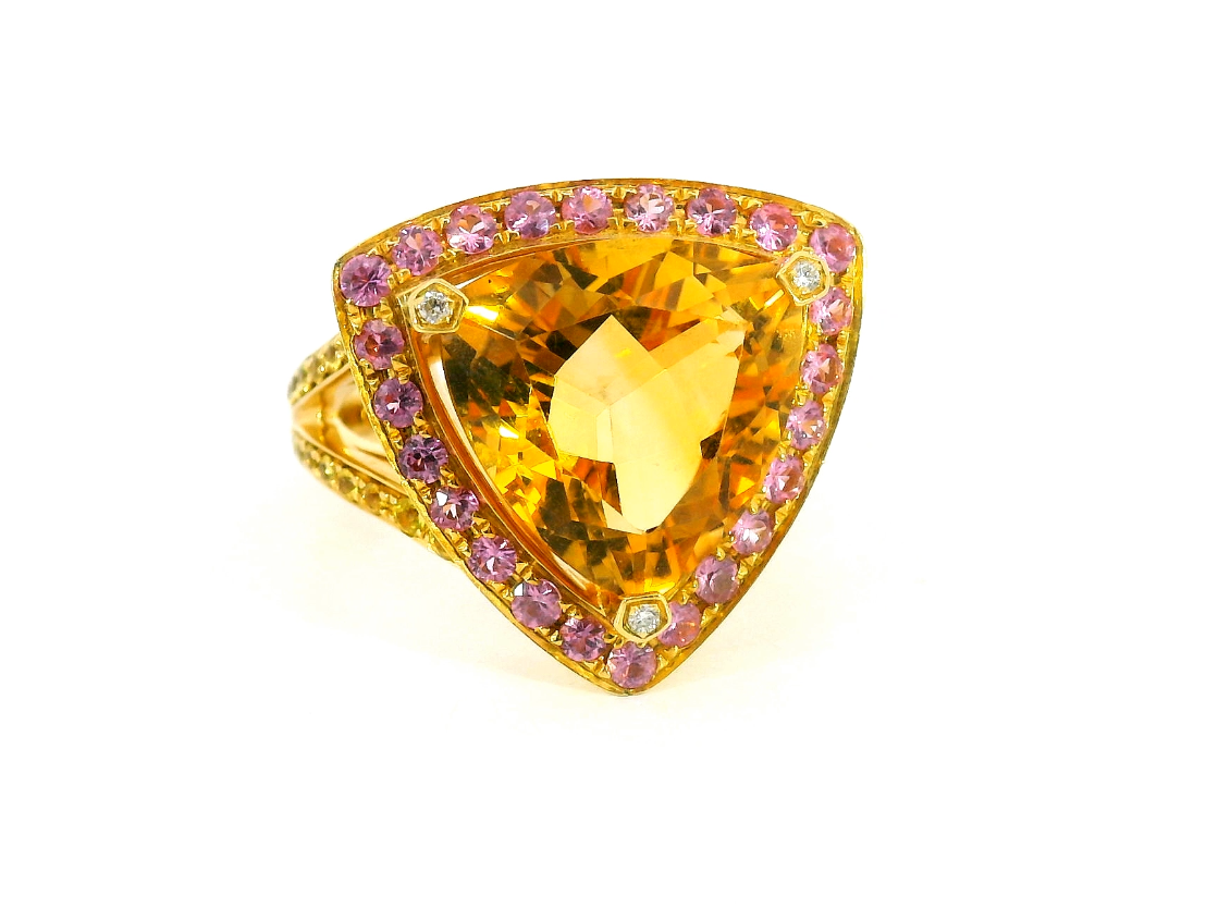 Оригинальное золотое кольцо с цитрином 5.98ct Mauboussin Mes Couleurs À Toi — настоящее произведение искусства, в котором воплощено не только мастерство ювелира, но и актуальные тренды. Это доказательство вашего изысканного вкуса, высокого статуса и яркий акцент в стильном образе. Вставка — 1 цитрин огранки "триллиант" 5.98ct, 24 розовых сапфира круглой огранки 0.73ct, 36 желтых сапфиров круглой огранки 0.56ct, 3 бриллианта круглой огранки 0.02ct 3/3, а обрамлением служит золото 750 пробы. Такое сочетание отлично смотрится и позволяет реализовывать самые необычные задумки вашего стиля. Размер ювелирного изделия — 18, бесплатно изменим на любой от 17.5 до 19, а общий вес — 10.99 г, и на пальце оно выглядит просто шикарно, сразу привлекая восхищенное внимание.