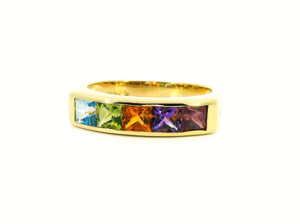 Оригинальное золотое кольцо с цветными камнями 1.23ct H.Stern Rainbow — настоящее произведение искусства, в котором воплощено не только мастерство ювелира, но и актуальные тренды. Это доказательство вашего изысканного вкуса, высокого статуса и яркий акцент в стильном образе. Вставка — 1 топаз квадратной огранки 0.25ct, 1 хризолит квадратной огранки 0.26ct, 1 цитрин квадратной огранки 0.23ct, 1 аметист квадратной огранки 0.23ct, 1 гранат квадратной огранки 0.26ct, 1 бриллиант круглой огранки 0.01ct 3/4, а обрамлением служит золото 750 пробы. Такое сочетание отлично смотрится и позволяет реализовывать самые необычные задумки вашего стиля. Размер ювелирного изделия — 18.25, бесплатно изменим на любой от 17.25 до 19.25, а общий вес — 4.48 г, и на пальце оно выглядит просто шикарно, сразу привлекая восхищенное внимание.