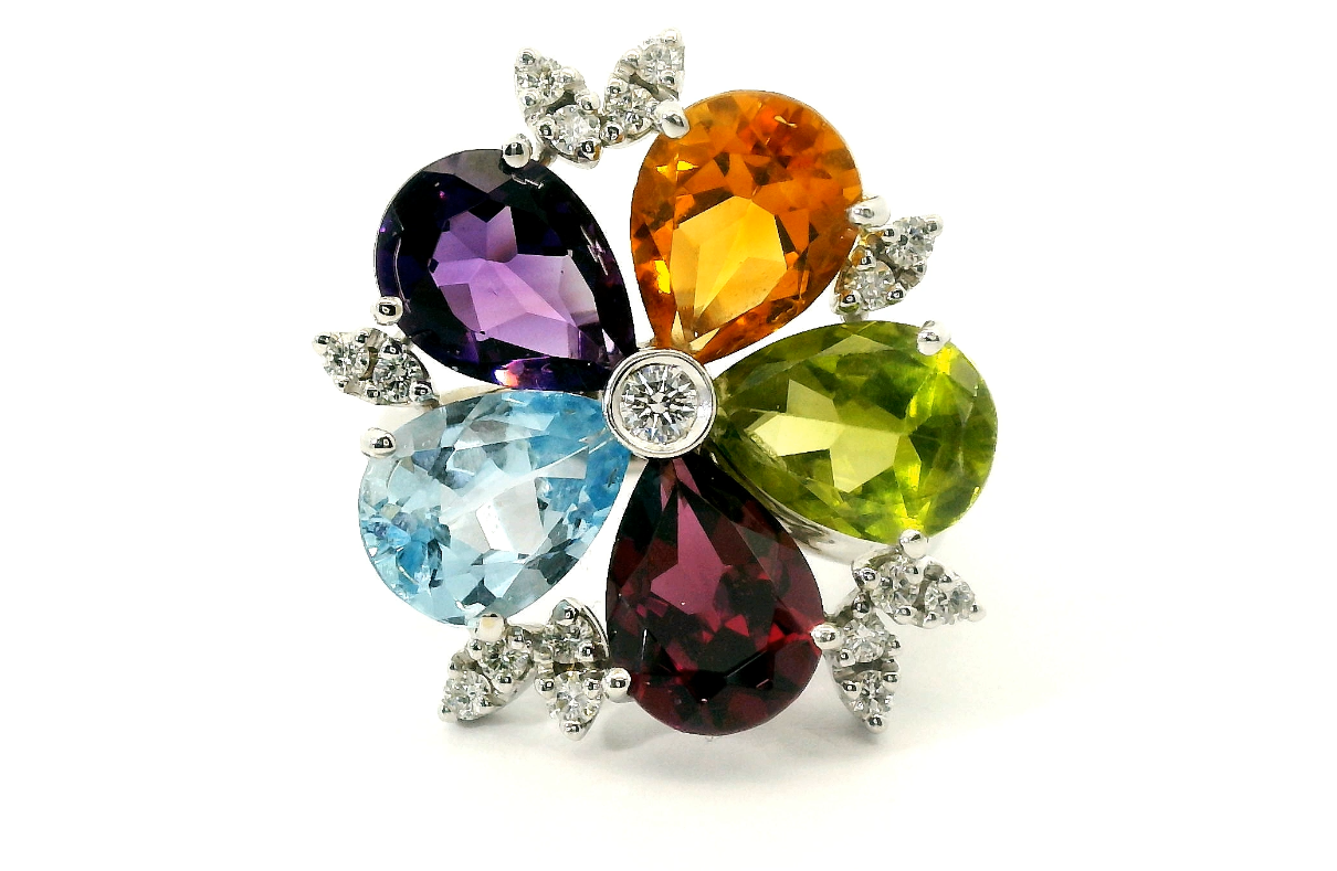 Оригинальное золотое кольцо с цветными камнями 9.21ct Gruppo Errepi — настоящее произведение искусства, в котором воплощено не только мастерство ювелира, но и актуальные тренды. Это доказательство вашего изысканного вкуса, высокого статуса и яркий акцент в стильном образе. Вставка — 1 гранат огранки "груша" 2.31ct, 1 топаз огранки "груша" 2.23ct, 1 аметист огранки "груша" 1.52ct, 1 цитрин огранки "груша" 1.52ct, 1 хризолит огранки "груша" 1.63ct, 1 бриллиант круглой огранки 0.07ct 3/4, 16 бриллиантов круглой огранки 0.28ct 3/4, а обрамлением служит золото 750 пробы. Такое сочетание отлично смотрится и позволяет реализовывать самые необычные задумки вашего стиля. Размер ювелирного изделия — 17.25, бесплатно изменим на любой от 16.25 до 18.25, а общий вес — 9.43 г, и на пальце оно выглядит просто шикарно, сразу привлекая восхищенное внимание.