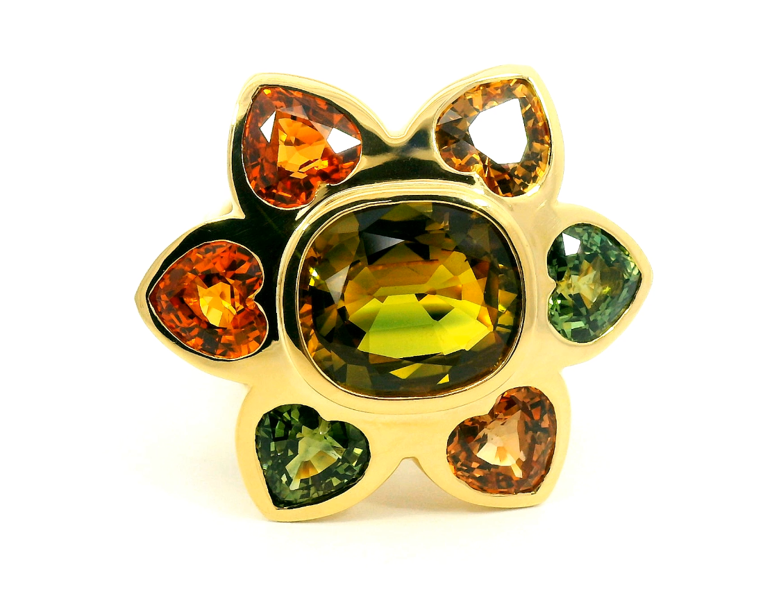 Оригинальное золотое кольцо с цветными сапфирами 16.10ct Tamara Comolli — настоящее произведение искусства, в котором воплощено не только мастерство ювелира, но и актуальные тренды. Это доказательство вашего изысканного вкуса, высокого статуса и яркий акцент в стильном образе. Вставка — 1 сапфир огранки "кушон" 6.50ct, 6 сапфиров огранки "сердце" 9.60ct, а обрамлением служит золото 750 пробы. Такое сочетание отлично смотрится и позволяет реализовывать самые необычные задумки вашего стиля. Размер ювелирного изделия — 17, бесплатно изменим на любой от 15 до 16.75, а общий вес — 31.74 г, и на пальце оно выглядит просто шикарно, сразу привлекая восхищенное внимание.