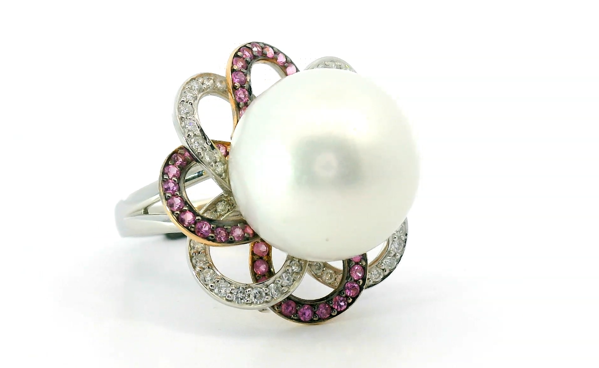 Оригинальное золотое кольцо с жемчугом 15.70 мм Legato — настоящее произведение искусства, в котором воплощено не только мастерство ювелира, но и актуальные тренды. Это доказательство вашего изысканного вкуса, высокого статуса и яркий акцент в стильном образе. Вставка — 1 жемчужина 15.70 мм, 48 бриллиантов круглой огранки 0.52ct 3/4-4/6, 48 сапфиров круглой огранки 0.58ct, а обрамлением служит золото 750 пробы. Такое сочетание отлично смотрится и позволяет реализовывать самые необычные задумки вашего стиля. Размер ювелирного изделия — 17.25, бесплатно изменим на любой от 16.25 до 18.75, а общий вес — 14.46 г, и на пальце оно выглядит просто шикарно, сразу привлекая восхищенное внимание.
