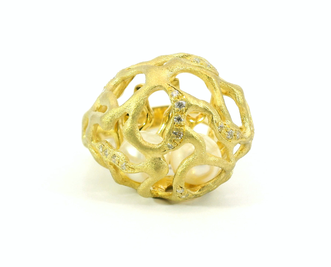 Оригинальное золотое кольцо с жемчугом 7.00 мм Annamaria Cammilli — настоящее произведение искусства, в котором воплощено не только мастерство ювелира, но и актуальные тренды. Это доказательство вашего изысканного вкуса, высокого статуса и яркий акцент в стильном образе. Вставка — 2 жемчуга 7.00 мм, 26 бриллиантов круглой огранки 0.20ct 3/3-3/4, а обрамлением служит золото 750 пробы. Такое сочетание отлично смотрится и позволяет реализовывать самые необычные задумки вашего стиля. Размер ювелирного изделия — 17.75, бесплатно изменим на любой от 16.75 до 18.75, а общий вес — 18.48 г, и на пальце оно выглядит просто шикарно, сразу привлекая восхищенное внимание.