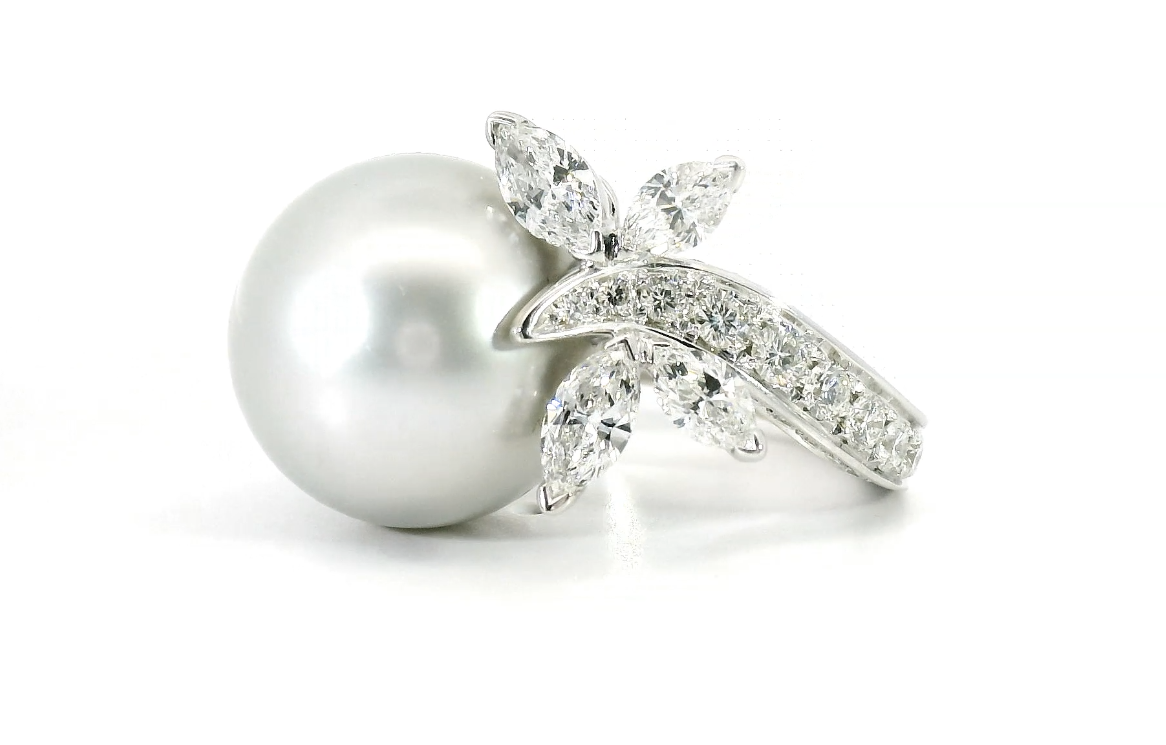 Оригинальное золотое кольцо с жемчугом Mikimoto — настоящее произведение искусства, в котором воплощено не только мастерство ювелира, но и актуальные тренды. Это доказательство вашего изысканного вкуса, высокого статуса и яркий акцент в стильном образе. Вставка — 1 жемчуг 16.00 мм, 2 бриллианта огранки "маркиз" 0.60ct 4/4 (F/VVS2), 2 бриллианта огранки "маркиз" 0.36ct 3/3, 56 бриллиантов круглой огранки 1.34ct 3/3, а обрамлением служит золото 750 пробы. Такое сочетание отлично смотрится и позволяет реализовывать самые необычные задумки вашего стиля. Размер ювелирного изделия — 16, а общий вес — 13.46 г, и на пальце оно выглядит просто шикарно, сразу привлекая восхищенное внимание.