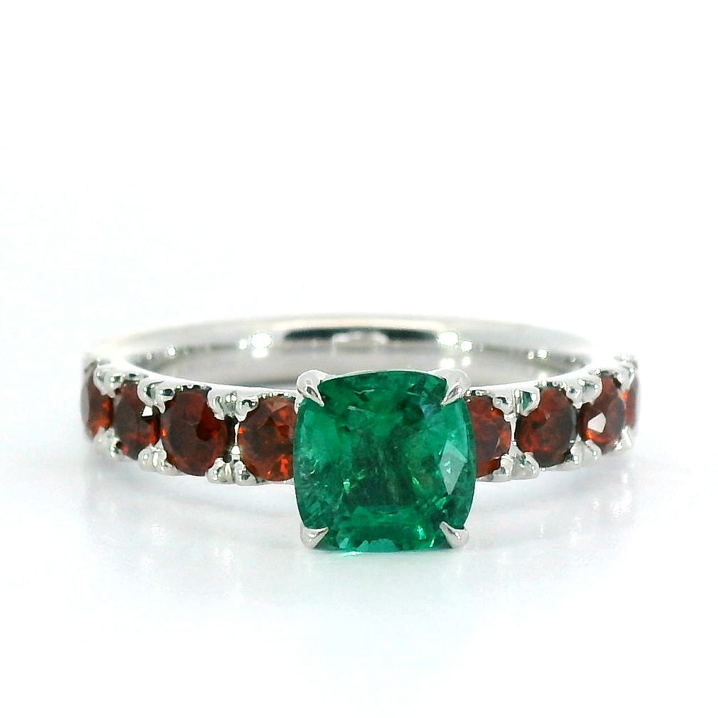 Платиновое кольцо с изумрудом Замбия 1.06ct Evgeny Matveev — настоящее произведение искусства, в котором воплощено не только мастерство ювелира, но и актуальные тренды. Это доказательство вашего изысканного вкуса, высокого статуса и яркий акцент в стильном образе. Вставка — 1 изумруд огранки "кушон" 1.06ct 3/Г3 Bellerophon B32938, 8 оранжево-красных сапфиров круглой огранки 1.01ct, 1 турмалин параиба круглой огранки 0.01ct, а обрамлением служит платина 950 пробы. Такое сочетание отлично смотрится и позволяет реализовывать самые необычные задумки вашего стиля. Размер ювелирного изделия — 17, бесплатно изменим на любой от 16.5 до 18, а общий вес — 6.55 г, и на пальце оно выглядит просто шикарно, сразу привлекая восхищенное внимание.