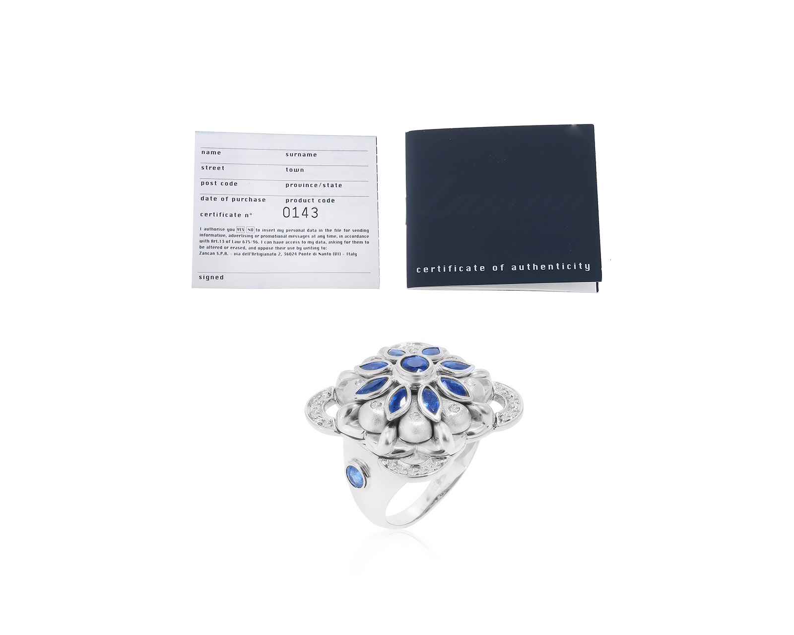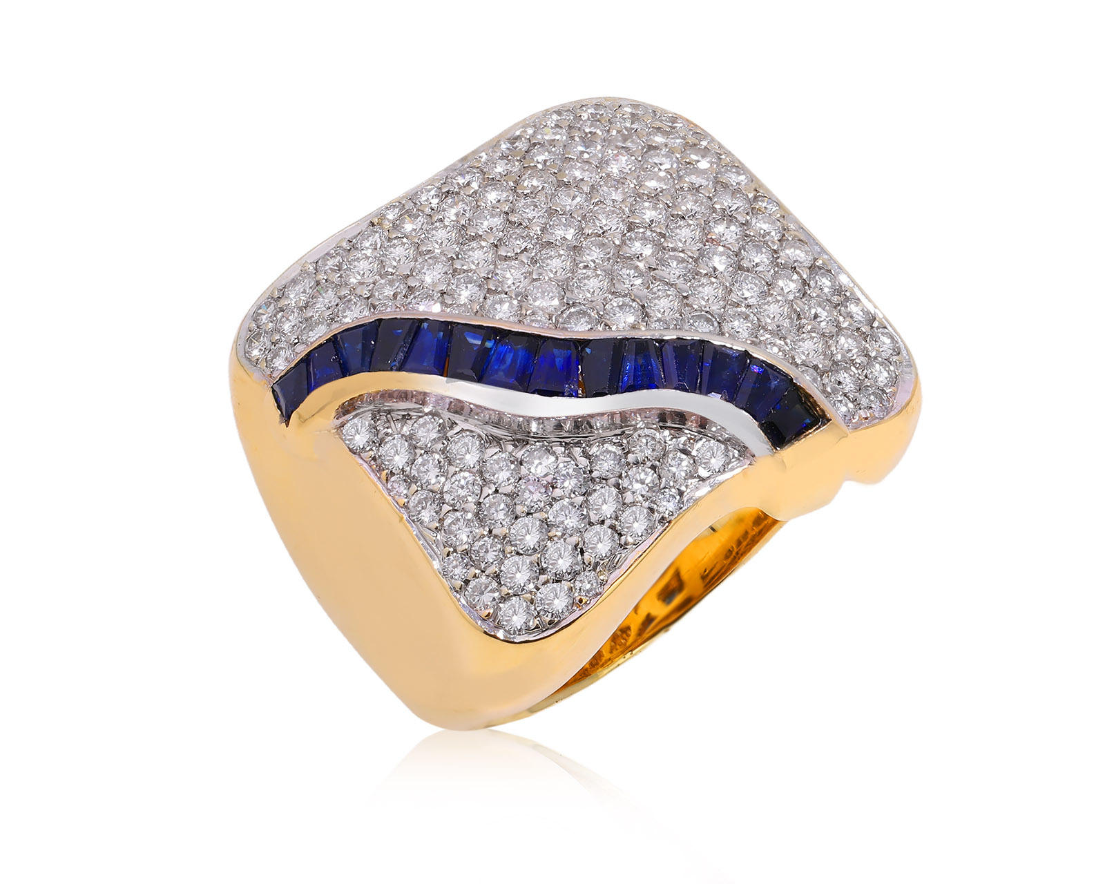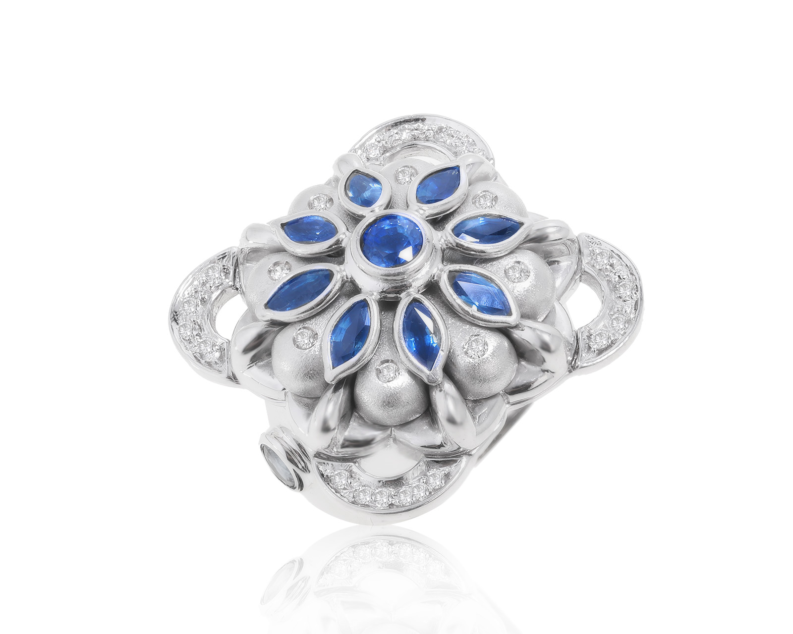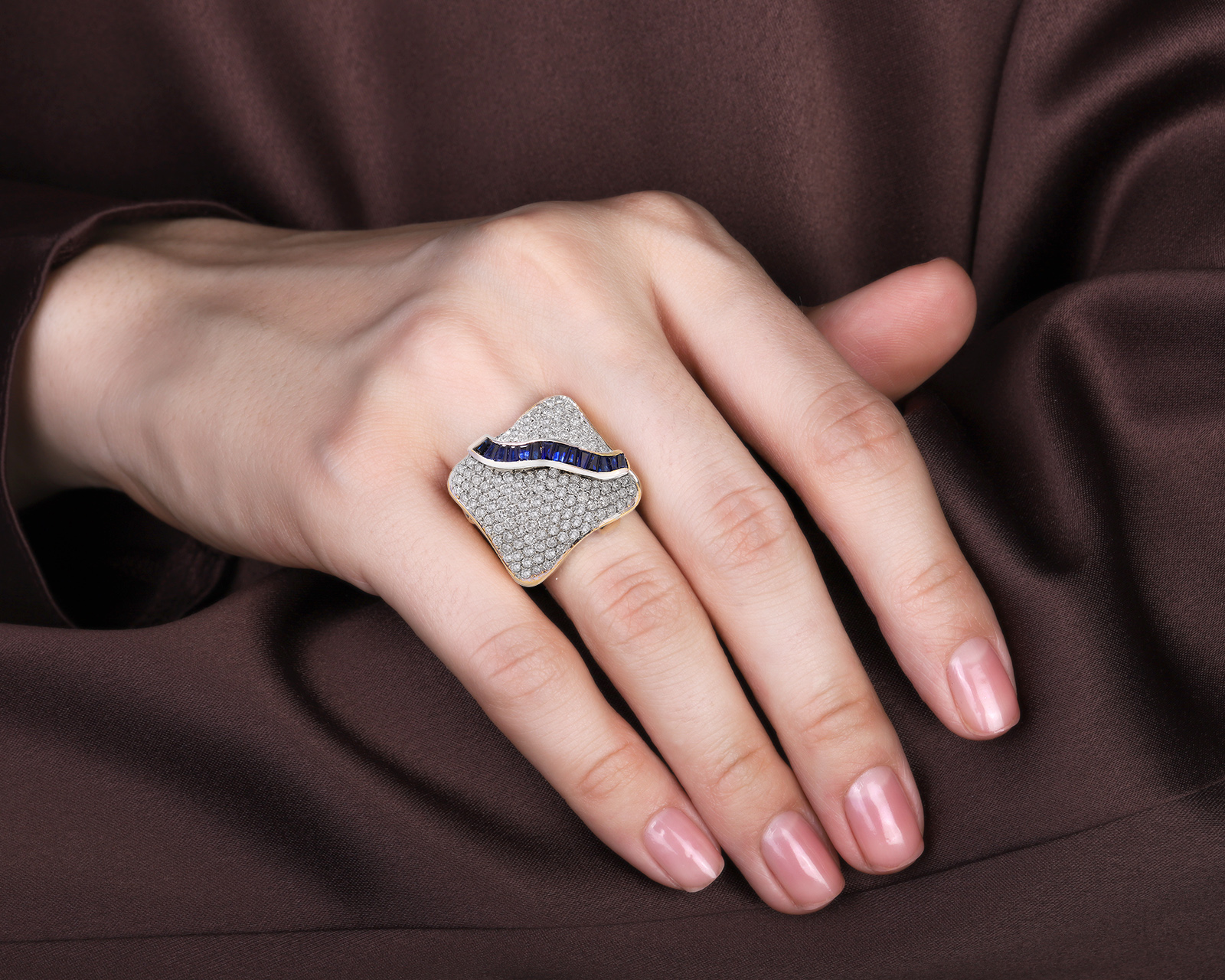 - дизайнерские модели фантазийной формы с большим сапфиром и россыпью бриллиантов;