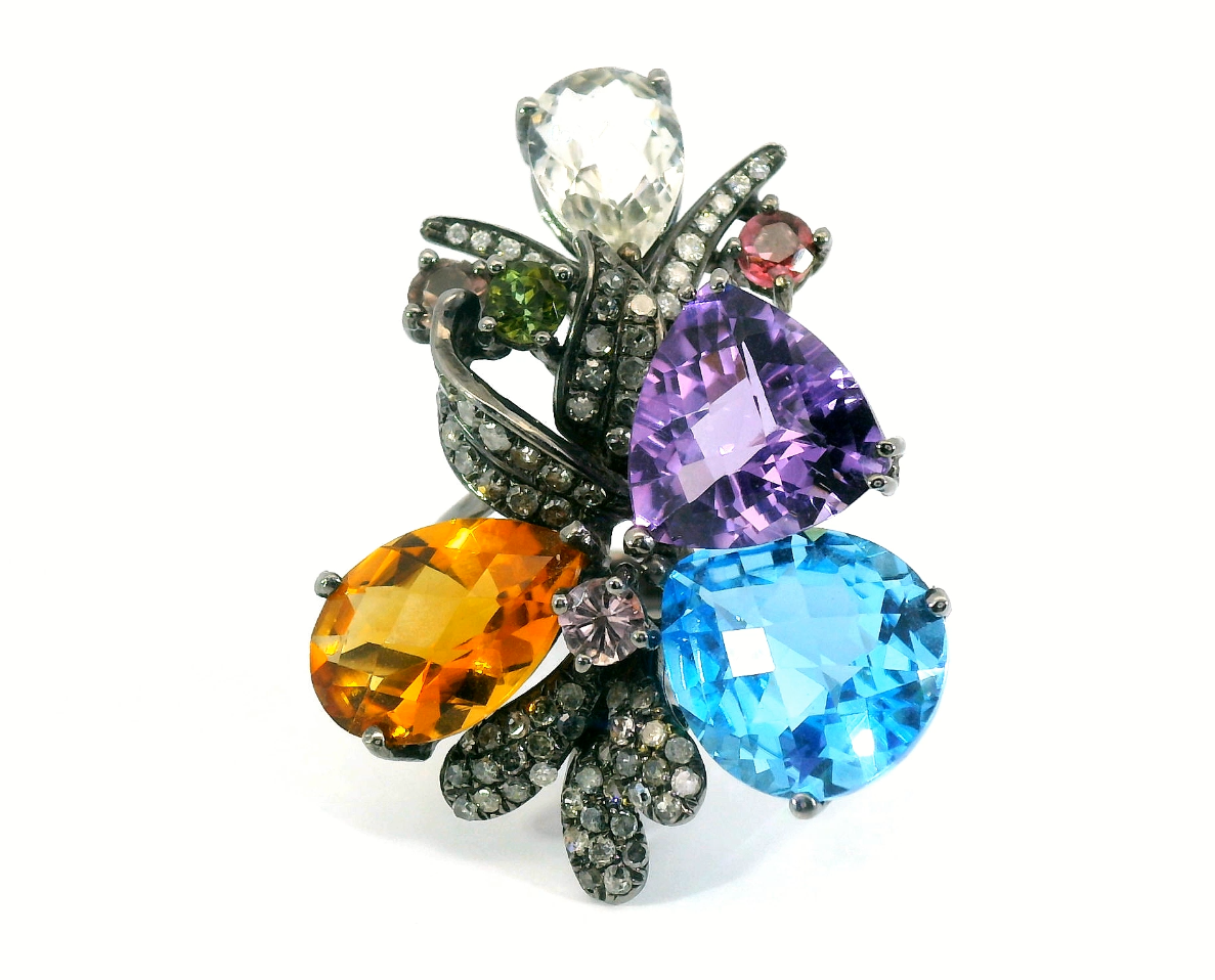 Шикарное золотое кольцо с цветными камнями 10.20ct — настоящее произведение искусства, в котором воплощено не только мастерство ювелира, но и актуальные тренды. Это доказательство вашего изысканного вкуса, высокого статуса и яркий акцент в стильном образе. Вставка — 61 бриллиант круглой огранки 0.49ct 3/4-4/5, 14 бриллиантов круглой огранки 0.10ct 2/4-3/5 Кр-17, 1 топаз огранки "фантазийная груша" 3.28ct, 2 цитрина огранки "фантазийная груша" 3.48ct, 1 аметист огранки "фантазийный триллиант" 2.88ct, 3 турмалина круглой огранки 0.42ct, 1 хризолит круглой огранки 0.14ct, а обрамлением служит золото 750 пробы. Такое сочетание отлично смотрится и позволяет реализовывать самые необычные задумки вашего стиля. Размер ювелирного изделия — 16.5, бесплатно изменим на любой от 15.5 до 18.5, а общий вес — 10.05 г, и на пальце оно выглядит просто шикарно, сразу привлекая восхищенное внимание.