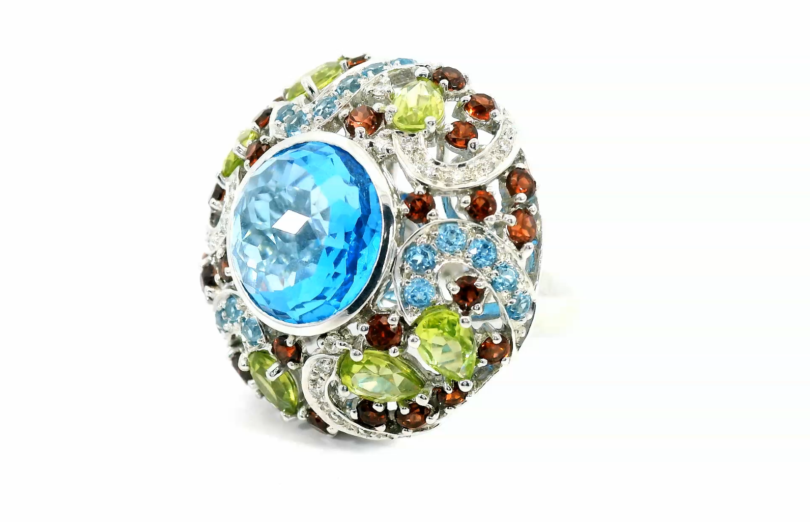 Шикарное золотое кольцо с цветными камнями 8.11ct — настоящее произведение искусства, в котором воплощено не только мастерство ювелира, но и актуальные тренды. Это доказательство вашего изысканного вкуса, высокого статуса и яркий акцент в стильном образе. Вставка — 1 топаз фантазийной огранки 5.22ct, 18 топазов круглой огранки 0.45ct, 6 хризолитов огранки "груша" 1.26ct, 27 гранатов круглой огранки 1.18ct, 21 бриллиант круглой огранки 0.11ct 3/4-4/4, а обрамлением служит золото 750 пробы. Такое сочетание отлично смотрится и позволяет реализовывать самые необычные задумки вашего стиля. Размер ювелирного изделия — 17.25, бесплатно изменим на любой от 15.25 до 18.25, а общий вес — 14.71 г, и на пальце оно выглядит просто шикарно, сразу привлекая восхищенное внимание.