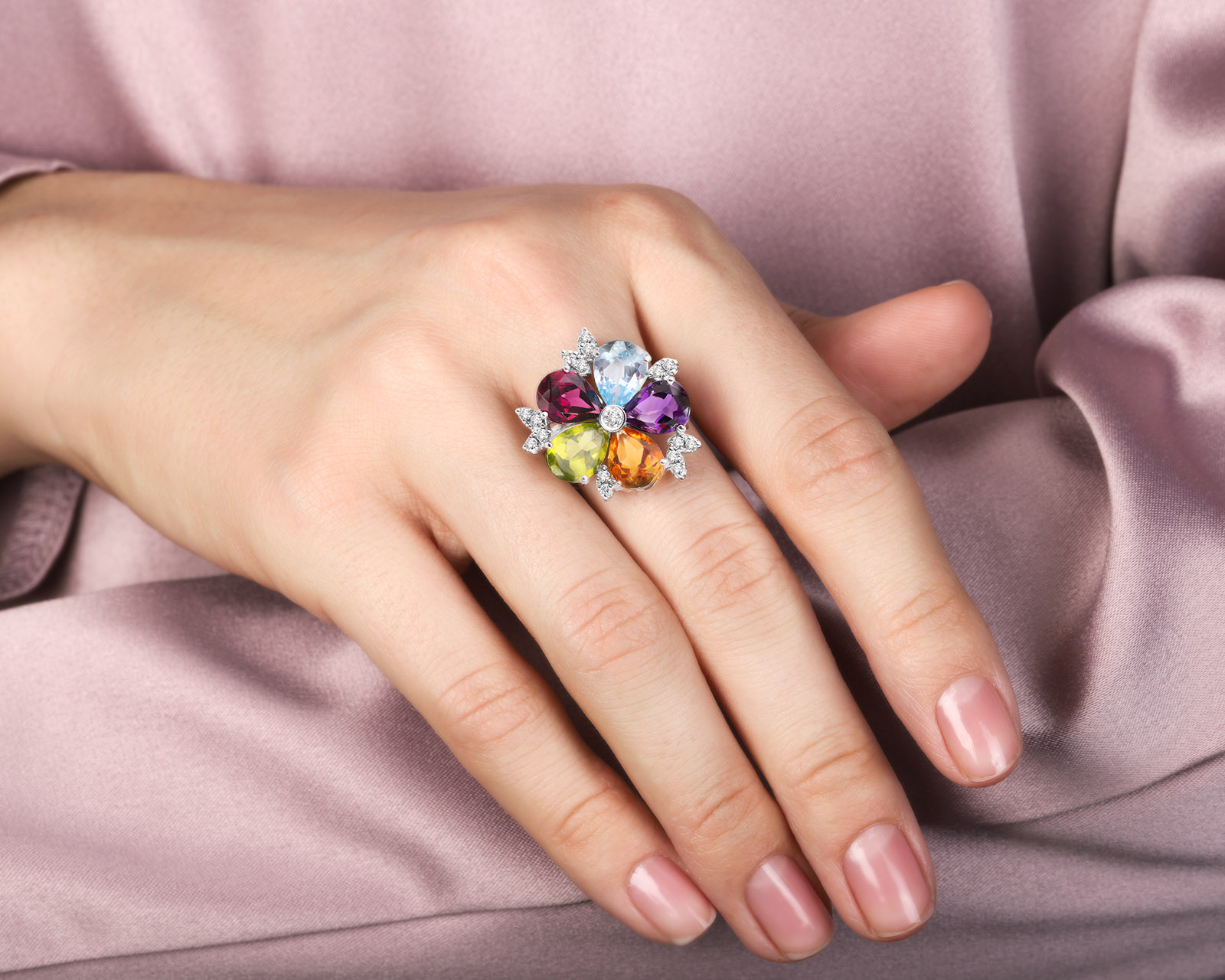 - праздничные кольца в южном стиле с топазами, рубинами, аметистами, сапфирами;