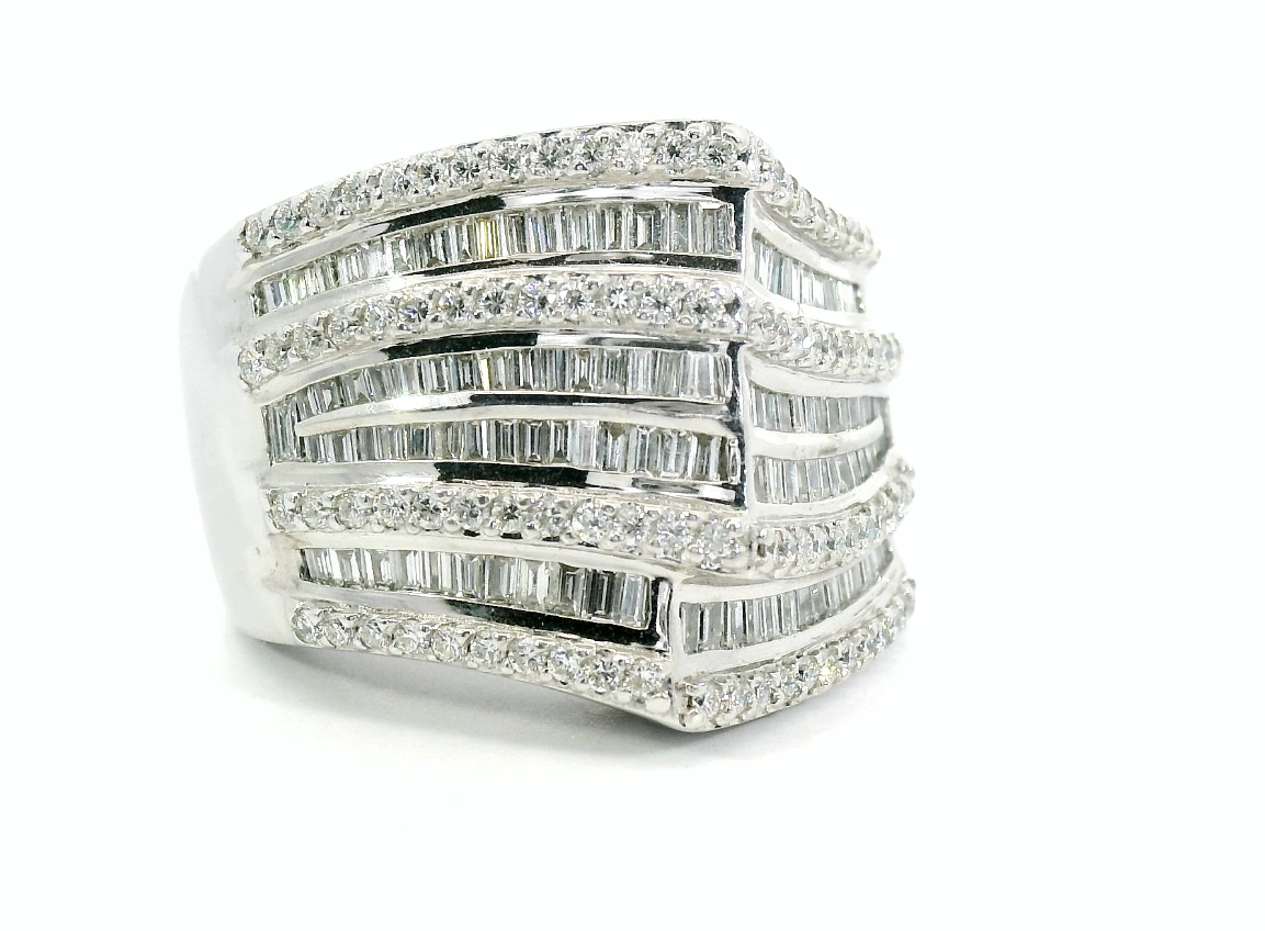 Великолепное золотое кольцо с бриллиантами 2.11ct — настоящее произведение искусства, в котором воплощено не только мастерство ювелира, но и актуальные тренды. Это доказательство вашего изысканного вкуса, высокого статуса и яркий акцент в стильном образе. Вставка — 91 бриллиант круглой огранки 0.67ct 3/3-4/4, 112 бриллиантов огранки "прямоугольный багет" 1.44ct 3/3-4/4, а обрамлением служит золото 750 пробы. Такое сочетание отлично смотрится и позволяет реализовывать самые необычные задумки вашего стиля. Размер ювелирного изделия — 17.75, бесплатно изменим на любой от 15.75 до 18.25, а общий вес — 14.51 г, и на пальце оно выглядит просто шикарно, сразу привлекая восхищенное внимание.