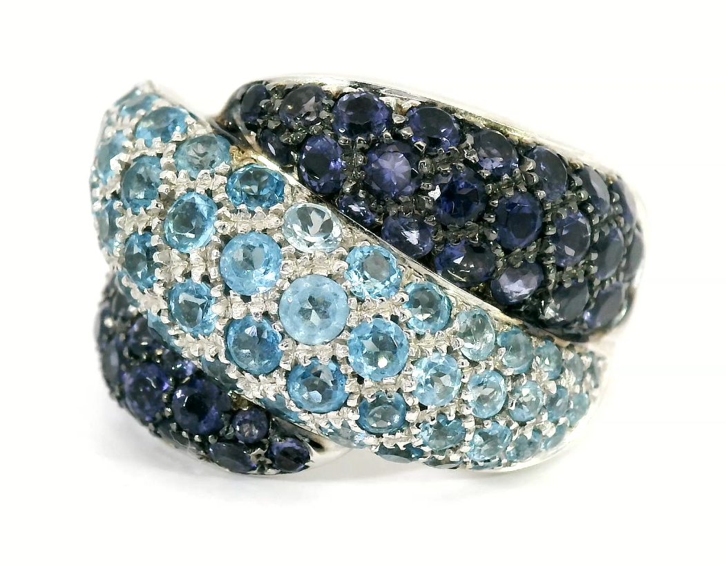 Оригинальное золотое кольцо с топазами и иолитами Damiani — настоящее произведение искусства, в котором воплощено не только мастерство ювелира, но и актуальные тренды. Это доказательство вашего изысканного вкуса, высокого статуса и яркий акцент в стильном образе. Вставка — 54 топаза круглой огранки, 43 иолита круглой огранки, а обрамлением служит золото 750 пробы. Такое сочетание отлично смотрится и позволяет реализовывать самые необычные задумки вашего стиля. Размер ювелирного изделия — 19, бесплатно изменим на любой от 17 до 18.75, а общий вес — 15.85 г, и на пальце оно выглядит просто шикарно, сразу привлекая восхищенное внимание.