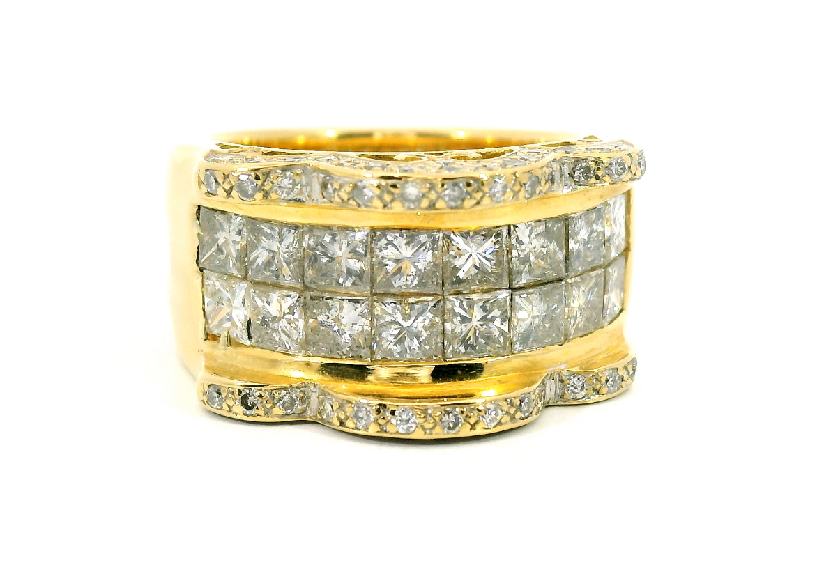 Восхитительное золотое кольцо с бриллиантами 2.93ct — настоящее произведение искусства, в котором воплощено не только мастерство ювелира, но и актуальные тренды. Это доказательство вашего изысканного вкуса, высокого статуса и яркий акцент в стильном образе. Вставка — 16 бриллиантов огранки "принцесса" 2.40ct 4/6-5/7, 64 бриллианта круглой огранки 0.53ct 4/5-5/6, а обрамлением служит золото 750 пробы. Такое сочетание отлично смотрится и позволяет реализовывать самые необычные задумки вашего стиля. Размер ювелирного изделия — 17, бесплатно изменим на 15, а общий вес — 14.17 г, и на пальце оно выглядит просто шикарно, сразу привлекая восхищенное внимание.