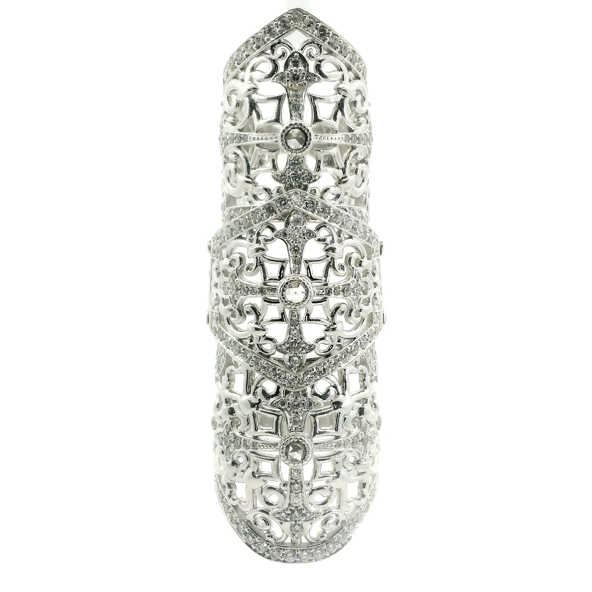 Золотое кольцо long finger с бриллиантами 5.27ct — настоящее произведение искусства, в котором воплощено не только мастерство ювелира, но и актуальные тренды. Это доказательство вашего изысканного вкуса, высокого статуса и яркий акцент в стильном образе. Вставка — 3 бриллианта огранки "роза" 0.12ct 6/5, 286 бриллиантов круглой огранки 5.15ct 3/5-4/7, а обрамлением служит золото 585 пробы. Такое сочетание отлично смотрится и позволяет реализовывать самые необычные задумки вашего стиля. Размер ювелирного изделия — 18, бесплатно изменим на любой от 17 до 19, а общий вес — 35.42 г, и на пальце оно выглядит просто шикарно, сразу привлекая восхищенное внимание.