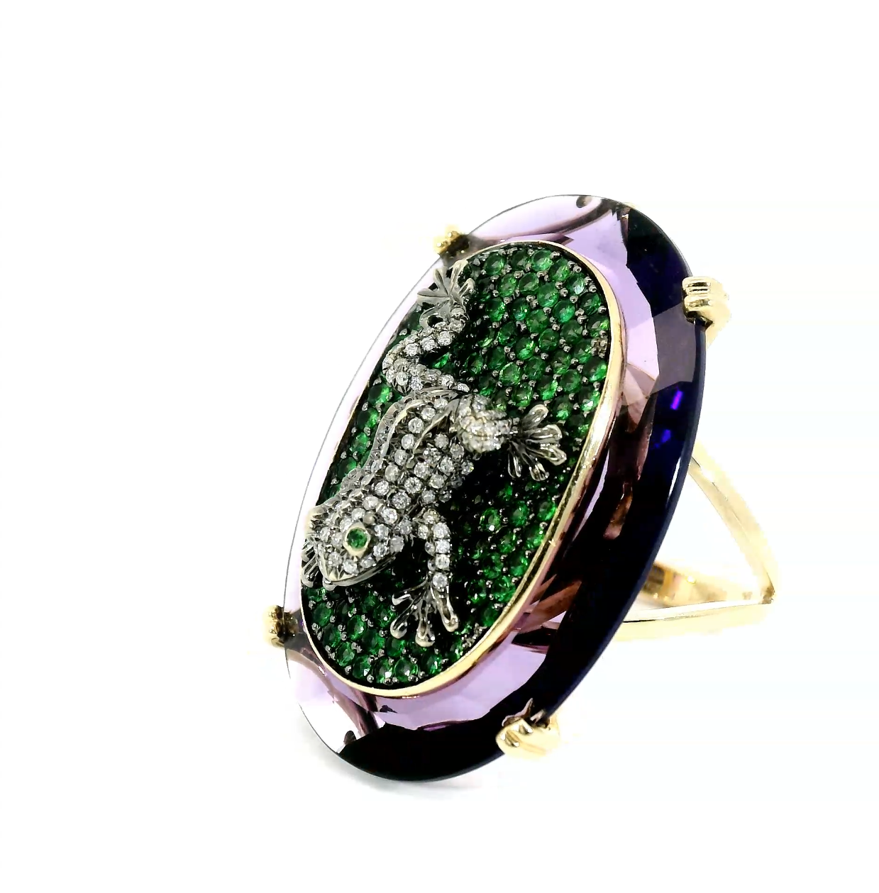 Золотое кольцо с аметистом 21.15ct и тсаворитами 3.04ct — настоящее произведение искусства, в котором воплощено не только мастерство ювелира, но и актуальные тренды. Это доказательство вашего изысканного вкуса, высокого статуса и яркий акцент в стильном образе. Вставка — 1 аметист огранки "фантазийный овал" 21.15ct, 152 тсаворита круглой огранки 3.04ct, 123 бриллианта круглой огранки 0.49ct 3/5-4/7, а обрамлением служит золото 585 пробы. Такое сочетание отлично смотрится и позволяет реализовывать самые необычные задумки вашего стиля. Размер ювелирного изделия — 19, бесплатно изменим на любой от 18.5 до 19.5, а общий вес — 17.82 г, и на пальце оно выглядит просто шикарно, сразу привлекая восхищенное внимание.
