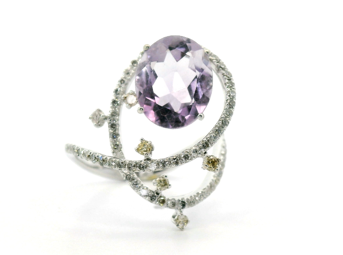 Золотое кольцо с аметистом 3.18ct и бриллиантами 0.61ct — настоящее произведение искусства, в котором воплощено не только мастерство ювелира, но и актуальные тренды. Это доказательство вашего изысканного вкуса, высокого статуса и яркий акцент в стильном образе. Вставка — 1 аметист овальной огранки 3.18ct, 6 бриллиантов круглой огранки 0.12ct 5/6, 62 бриллианта круглой огранки 0.49ct 4/5-5/7, а обрамлением служит золото 750 пробы. Такое сочетание отлично смотрится и позволяет реализовывать самые необычные задумки вашего стиля. Размер ювелирного изделия — 17.5, бесплатно изменим на любой от 16.5 до 19, а общий вес — 5.11 г, и на пальце оно выглядит просто шикарно, сразу привлекая восхищенное внимание.