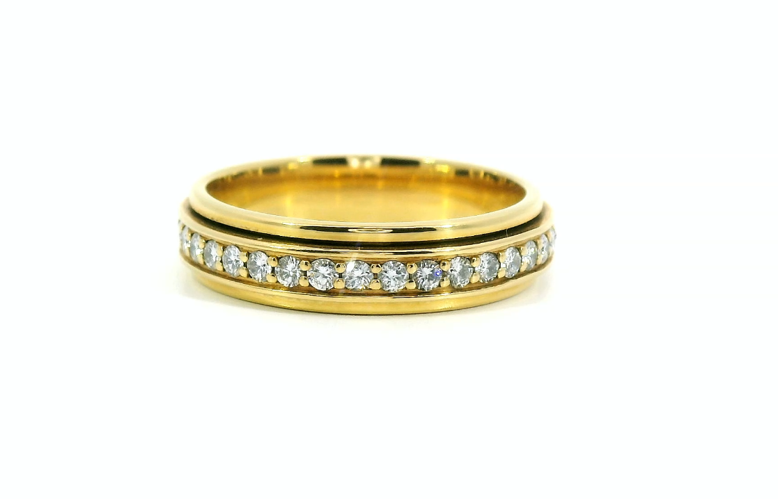 Оригинальное золотое кольцо с бриллиантами 0.55ct Piaget Possession — настоящее произведение искусства, в котором воплощено не только мастерство ювелира, но и актуальные тренды. Это доказательство вашего изысканного вкуса, высокого статуса и яркий акцент в стильном образе. Вставка — 36 бриллиантов круглой огранки 0.55ct 2/3-3/3, Ширина кольца 4,5 мм, а обрамлением служит золото 750 пробы. Такое сочетание отлично смотрится и позволяет реализовывать самые необычные задумки вашего стиля. Размер ювелирного изделия — 16.75, бесплатно изменим на любой от 14.75 до 16.5, а общий вес — 4.45 г, и на пальце оно выглядит просто шикарно, сразу привлекая восхищенное внимание.