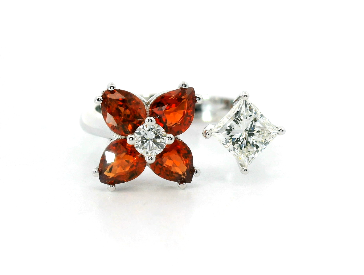 Золотое кольцо с бриллиантами 0.81ct и сапфирами 1.74ct Evgeny Matveev — настоящее произведение искусства, в котором воплощено не только мастерство ювелира, но и актуальные тренды. Это доказательство вашего изысканного вкуса, высокого статуса и яркий акцент в стильном образе. Вставка — 4 оранжевых сапфира огранки "груша" 1.74ct, 1 турмалин параиба круглой огранки 0.01ct, 1 бриллиант круглой огранки 0.11ct 3/5, 1 бриллиант огранки "принцесса" 0.70ct 5/4 (G/VVS2) GIA 1473278388, а обрамлением служит золото 750 пробы. Такое сочетание отлично смотрится и позволяет реализовывать самые необычные задумки вашего стиля. Размер ювелирного изделия — 17, а общий вес — 4.19 г, и на пальце оно выглядит просто шикарно, сразу привлекая восхищенное внимание.