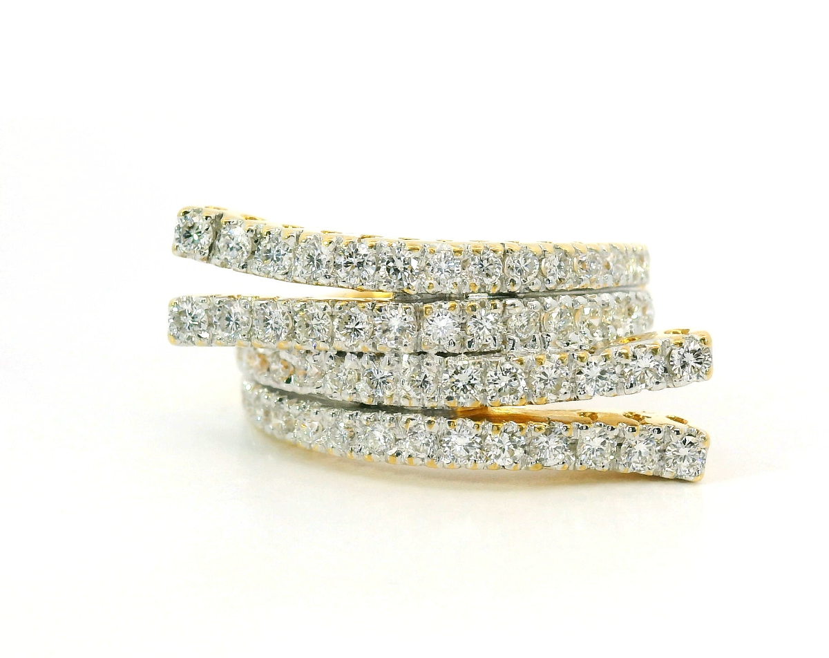 Золотое кольцо с бриллиантами 1.40ct — настоящее произведение искусства, в котором воплощено не только мастерство ювелира, но и актуальные тренды. Это доказательство вашего изысканного вкуса, высокого статуса и яркий акцент в стильном образе. Вставка — 56 бриллиантов круглой огранки 1.40ct 3/3-4/4, а обрамлением служит золото 750 пробы. Такое сочетание отлично смотрится и позволяет реализовывать самые необычные задумки вашего стиля. Размер ювелирного изделия — 17.5, бесплатно изменим на любой от 16.5 до 18.5, а общий вес — 7.44 г, и на пальце оно выглядит просто шикарно, сразу привлекая восхищенное внимание.
