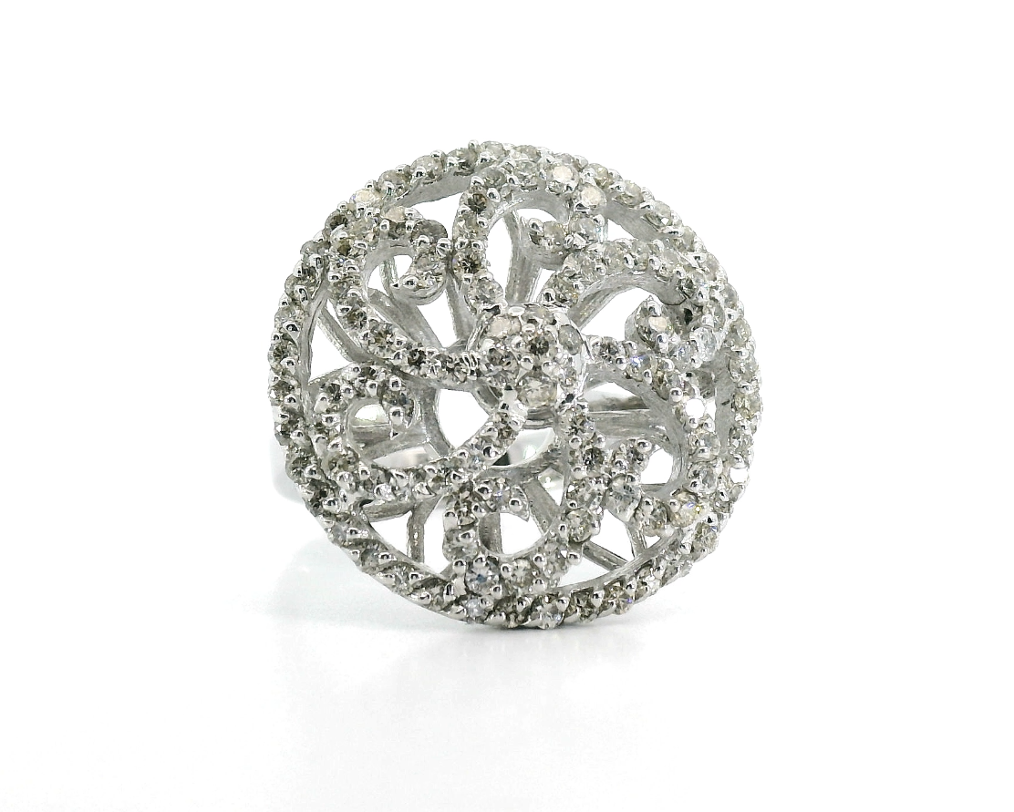 Золотое кольцо с бриллиантами 1.71ct — настоящее произведение искусства, в котором воплощено не только мастерство ювелира, но и актуальные тренды. Это доказательство вашего изысканного вкуса, высокого статуса и яркий акцент в стильном образе. Вставка — 107 бриллиантов круглой огранки 1.71ct 4/3-6/6, а обрамлением служит золото 750 пробы. Такое сочетание отлично смотрится и позволяет реализовывать самые необычные задумки вашего стиля. Размер ювелирного изделия — 17.25, бесплатно изменим на любой от 16.25 до 18.75, а общий вес — 10.09 г, и на пальце оно выглядит просто шикарно, сразу привлекая восхищенное внимание.
