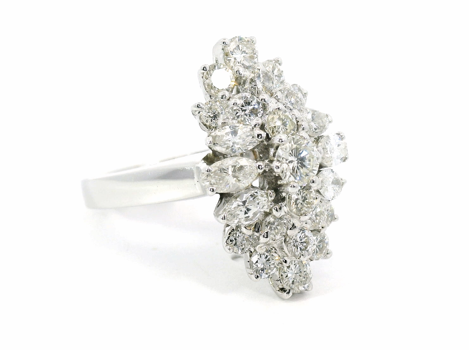 Золотое кольцо с бриллиантами 1.94ct — настоящее произведение искусства, в котором воплощено не только мастерство ювелира, но и актуальные тренды. Это доказательство вашего изысканного вкуса, высокого статуса и яркий акцент в стильном образе. Вставка — 1 бриллиант круглой огранки 0.22ct 5/4, 6 бриллиантов огранки "маркиз" 0.59ct 4/5-5/6, 16 бриллиантов круглой огранки 1.00ct 3/5-4/6, 2 бриллианта круглой огранки 0.13ct 5/5, а обрамлением служит золото 750 пробы. Такое сочетание отлично смотрится и позволяет реализовывать самые необычные задумки вашего стиля. Размер ювелирного изделия — 17.5, бесплатно изменим на любой от 15.5 до 18.5, а общий вес — 9.51 г, и на пальце оно выглядит просто шикарно, сразу привлекая восхищенное внимание.