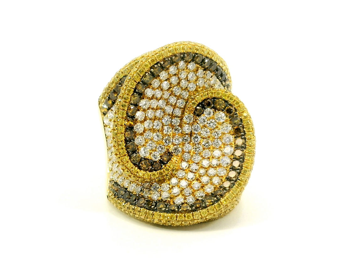 Золотое кольцо с бриллиантами 4.98ct — настоящее произведение искусства, в котором воплощено не только мастерство ювелира, но и актуальные тренды. Это доказательство вашего изысканного вкуса, высокого статуса и яркий акцент в стильном образе. Вставка — 237 бриллиантов круглой огранки 2.76ct 3/4-4/5, 68 фантазийно-желтых бриллиантов круглой огранки 1.03ct 7/3-7/5, 234 фантазийно-желтых бриллианта круглой огранки 1.19ct 5/3-5/6, а обрамлением служит золото 750 пробы. Такое сочетание отлично смотрится и позволяет реализовывать самые необычные задумки вашего стиля. Размер ювелирного изделия — 16.75, бесплатно изменим на любой от 14.75 до 16.5, а общий вес — 19.01 г, и на пальце оно выглядит просто шикарно, сразу привлекая восхищенное внимание.