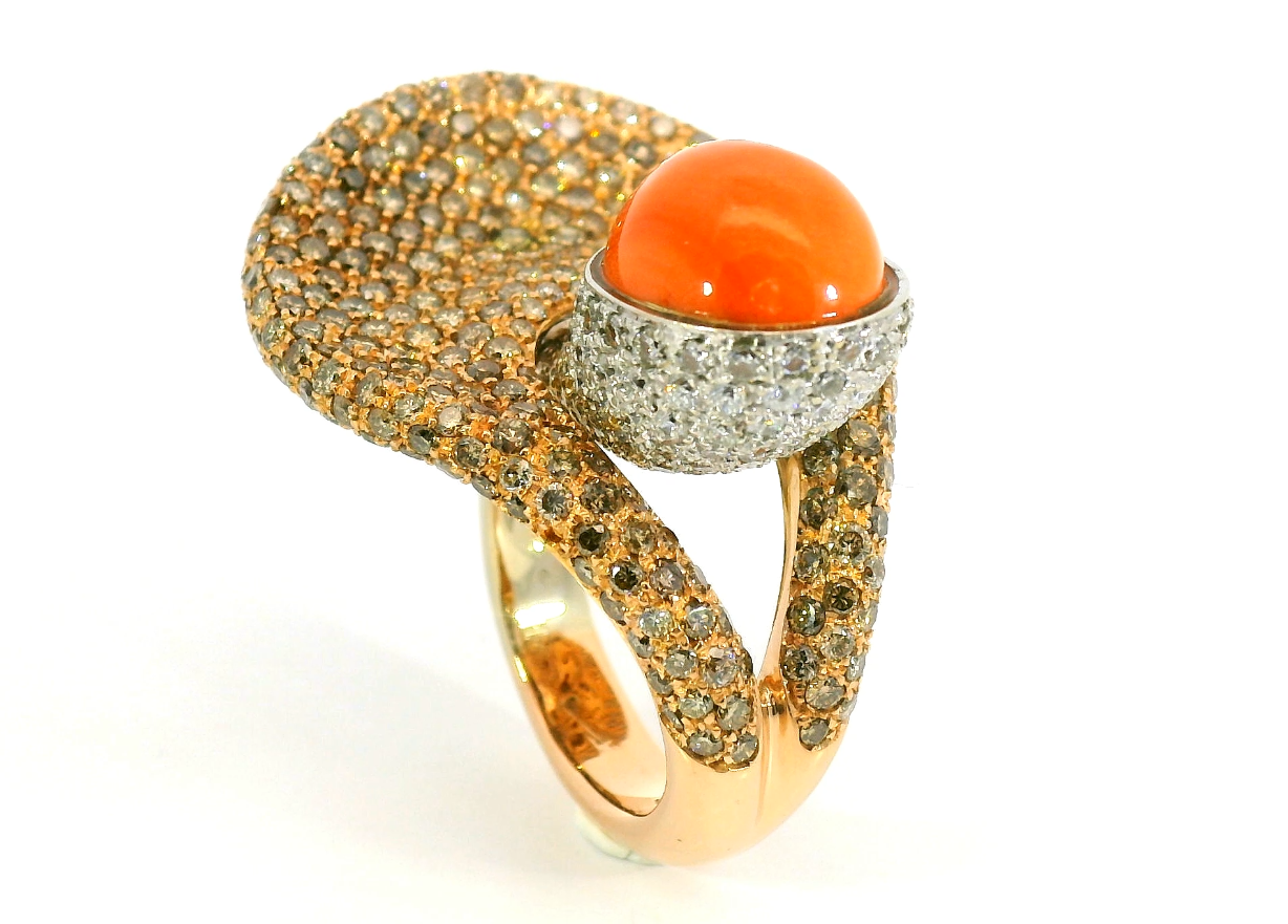 Золотое кольцо с бриллиантами 5.95ct и кораллом 4.60ct — настоящее произведение искусства, в котором воплощено не только мастерство ювелира, но и актуальные тренды. Это доказательство вашего изысканного вкуса, высокого статуса и яркий акцент в стильном образе. Вставка — 1 коралл огранки "овальный кабошон" 4.60ct, 399 бриллиантов круглой огранки 4.50ct 6/4-7/5, 133 бриллианта круглой огранки 1.45ct 3/3-4/4, а обрамлением служит золото 750 пробы. Такое сочетание отлично смотрится и позволяет реализовывать самые необычные задумки вашего стиля. Размер ювелирного изделия — 17, бесплатно изменим на любой от 16 до 18, а общий вес — 29.73 г, и на пальце оно выглядит просто шикарно, сразу привлекая восхищенное внимание.