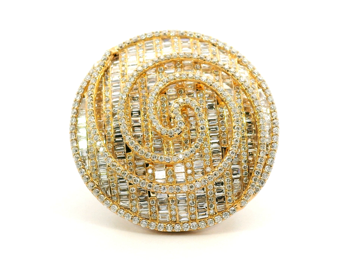 Золотое кольцо с бриллиантами 6.28ct — настоящее произведение искусства, в котором воплощено не только мастерство ювелира, но и актуальные тренды. Это доказательство вашего изысканного вкуса, высокого статуса и яркий акцент в стильном образе. Вставка — 416 бриллиантов круглой огранки 2.08ct 3/3-3/4, 205 бриллиантов огранки "прямоугольный багет" 4.20ct 3/3, а обрамлением служит золото 750 пробы. Такое сочетание отлично смотрится и позволяет реализовывать самые необычные задумки вашего стиля. Размер ювелирного изделия — 17.5, бесплатно изменим на любой от 16.5 до 18.5, а общий вес — 21.91 г, и на пальце оно выглядит просто шикарно, сразу привлекая восхищенное внимание.