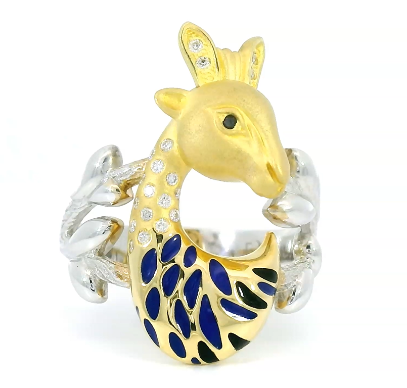 Золотое кольцо с эмалью и бриллиантами 0.11ct Evgeny Matveev — настоящее произведение искусства, в котором воплощено не только мастерство ювелира, но и актуальные тренды. Это доказательство вашего изысканного вкуса, высокого статуса и яркий акцент в стильном образе. Вставка — 2 черных бриллианта круглой огранки 0.01ct 7/9, 19 бриллиантов круглой огранки 0.10ct 3/3-3/4, а обрамлением служит золото 750 пробы. Такое сочетание отлично смотрится и позволяет реализовывать самые необычные задумки вашего стиля. Размер ювелирного изделия — 17.5, бесплатно изменим на любой от 16.5 до 18.5, а общий вес — 7.98 г, и на пальце оно выглядит просто шикарно, сразу привлекая восхищенное внимание.