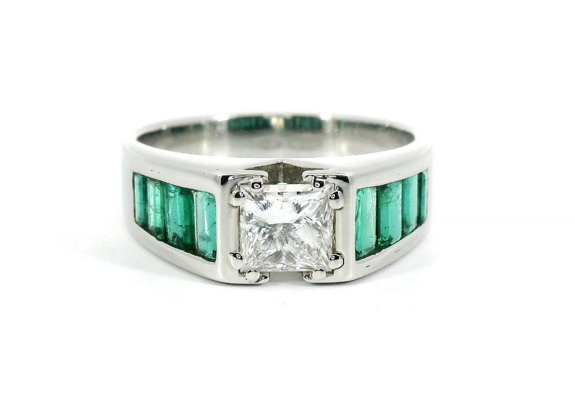 Золотое кольцо с изумрудами 1.30ct и бриллиантом 1.00ct — настоящее произведение искусства, в котором воплощено не только мастерство ювелира, но и актуальные тренды. Это доказательство вашего изысканного вкуса, высокого статуса и яркий акцент в стильном образе. Вставка — 8 изумрудов огранки "багет" 1.30ct 3/Г3, 1 бриллиант огранки "принцесса" 1.00ct 5/5 (G/VS1), а обрамлением служит золото 750 пробы. Такое сочетание отлично смотрится и позволяет реализовывать самые необычные задумки вашего стиля. Размер ювелирного изделия — 19.25, бесплатно изменим на любой от 17.25 до 19, а общий вес — 6.87 г, и на пальце оно выглядит просто шикарно, сразу привлекая восхищенное внимание.