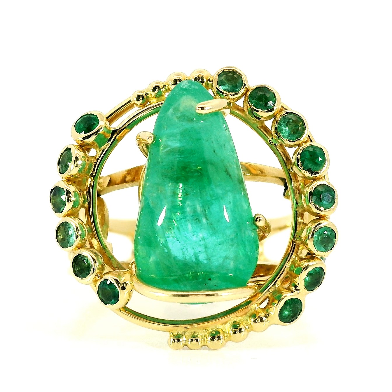 Золотое кольцо с изумрудами 8.75ct — настоящее произведение искусства, в котором воплощено не только мастерство ювелира, но и актуальные тренды. Это доказательство вашего изысканного вкуса, высокого статуса и яркий акцент в стильном образе. Вставка — 1 изумруд огранки "кабошон груша" 7.95ct 4/К1, 16 изумрудов круглой огранки 0.80ct 3/Г3-5/Г3, 2 бриллианта круглой огранки 0.06ct 3/4, а обрамлением служит золото 585 пробы. Такое сочетание отлично смотрится и позволяет реализовывать самые необычные задумки вашего стиля. Размер ювелирного изделия — 20, бесплатно изменим на любой от 19 до 21, а общий вес — 9.46 г, и на пальце оно выглядит просто шикарно, сразу привлекая восхищенное внимание.
