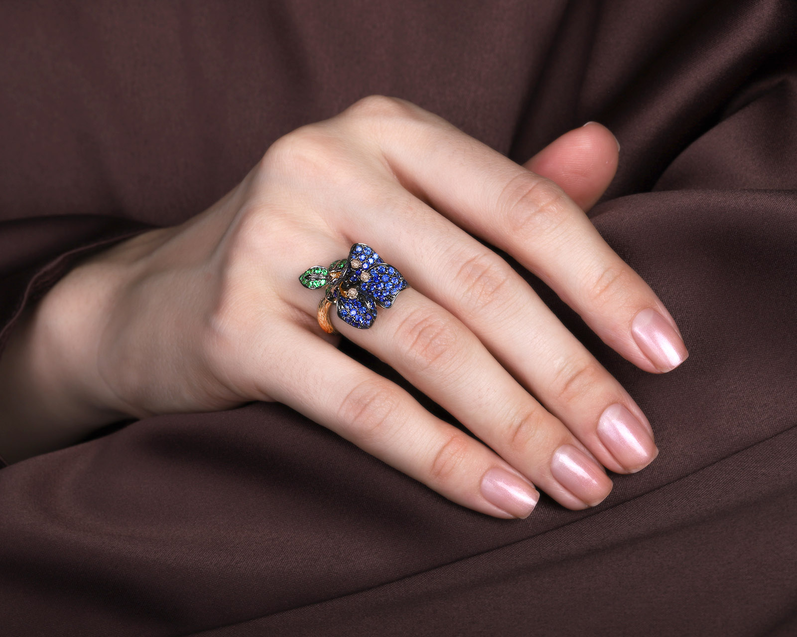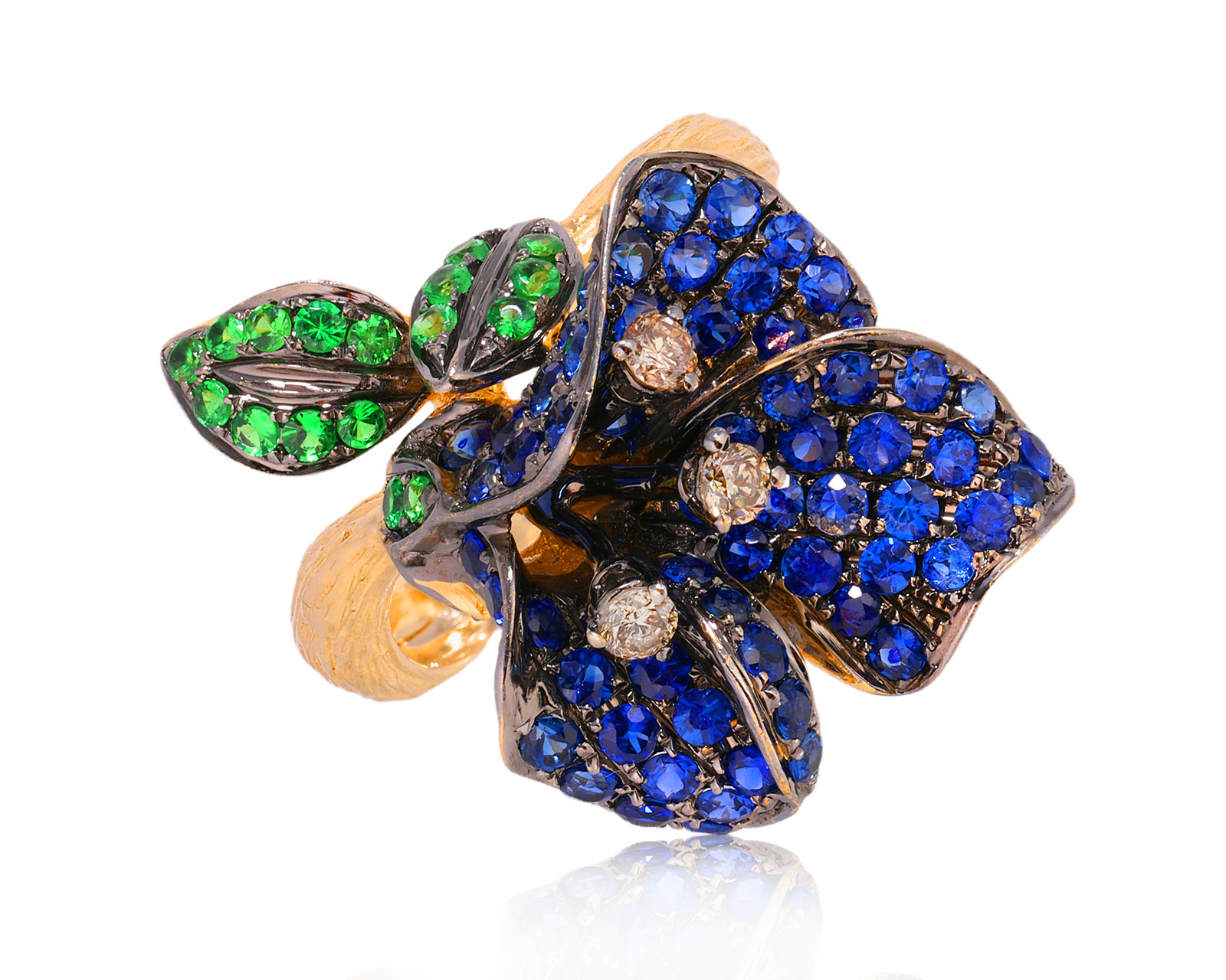 Золотое кольцо с сапфирами 1.30ct и тсаворитами 0.38ct
