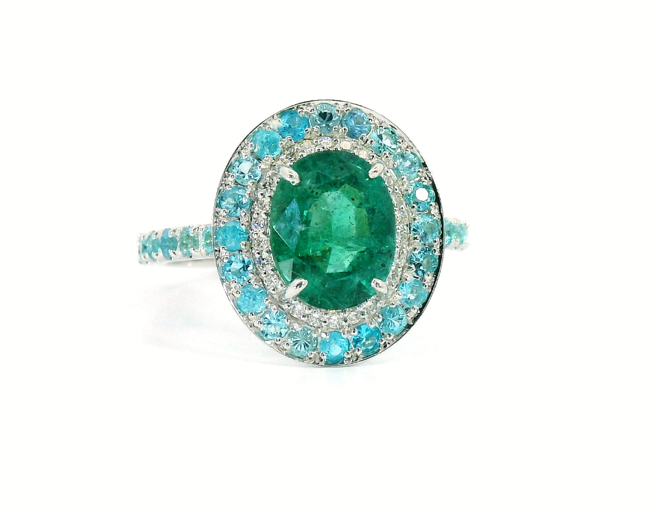 Золотое кольцо с изумрудом Замбия 2.00ct Evgeny Matveev — настоящее произведение искусства, в котором воплощено не только мастерство ювелира, но и актуальные тренды. Это доказательство вашего изысканного вкуса, высокого статуса и яркий акцент в стильном образе. Вставка — 1 изумруд Замбия овальной огранки 2.00ct 3/Г3 Bellerophon B33505, 31 турмалин параиба круглой огранки 0.59ct, 22 бриллианта круглой огранки 0.10ct 3/3-3/5, а обрамлением служит золото 750 пробы. Такое сочетание отлично смотрится и позволяет реализовывать самые необычные задумки вашего стиля. Размер ювелирного изделия — 17.25, бесплатно изменим на любой от 16.25 до 18.25, а общий вес — 4.82 г, и на пальце оно выглядит просто шикарно, сразу привлекая восхищенное внимание.