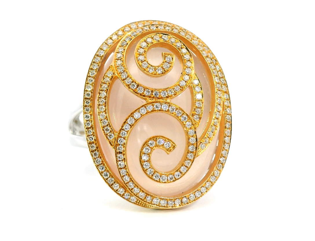 Золотое кольцо с кварцем 20.08ct и бриллиантами 0.56ct — настоящее произведение искусства, в котором воплощено не только мастерство ювелира, но и актуальные тренды. Это доказательство вашего изысканного вкуса, высокого статуса и яркий акцент в стильном образе. Вставка — 1 розовый кварц огранки "овальный кабошон" 20.08ct, 183 бриллианта круглой огранки 0.56ct 3/3-3/5, а обрамлением служит золото 750 пробы. Такое сочетание отлично смотрится и позволяет реализовывать самые необычные задумки вашего стиля. Размер ювелирного изделия — 19, бесплатно изменим на любой от 18.5 до 19.5, а общий вес — 15.19 г, и на пальце оно выглядит просто шикарно, сразу привлекая восхищенное внимание.