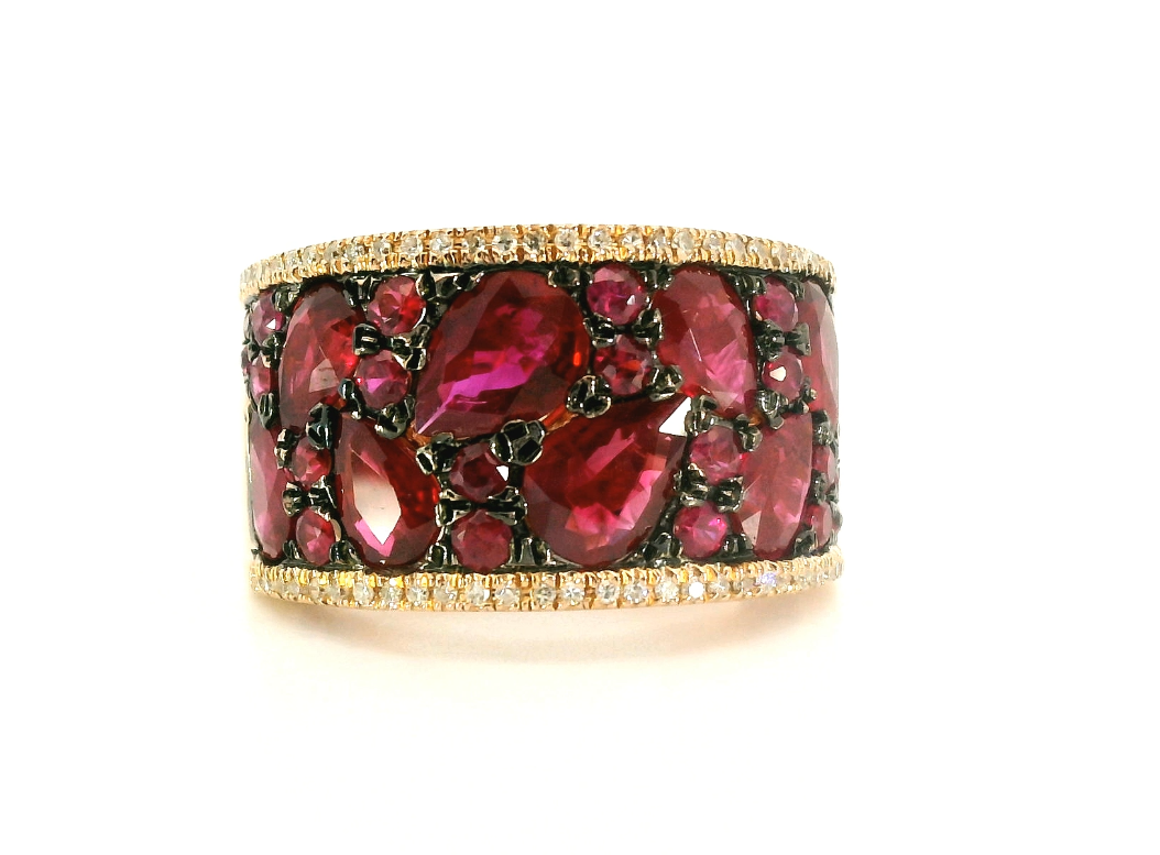 Золотое кольцо с рубинами 6.48ct и бриллиантами 0.16ct — настоящее произведение искусства, в котором воплощено не только мастерство ювелира, но и актуальные тренды. Это доказательство вашего изысканного вкуса, высокого статуса и яркий акцент в стильном образе. Вставка — 20 рубинов круглой огранки 0.68ct 4/3, 8 рубинов огранки "груша" 4.00ct 4/4, 54 бриллианта круглой огранки 0.16ct 2/2-3/3, а обрамлением служит золото 585 пробы. Такое сочетание отлично смотрится и позволяет реализовывать самые необычные задумки вашего стиля. Размер ювелирного изделия — 17, а общий вес — 9.15 г, и на пальце оно выглядит просто шикарно, сразу привлекая восхищенное внимание.