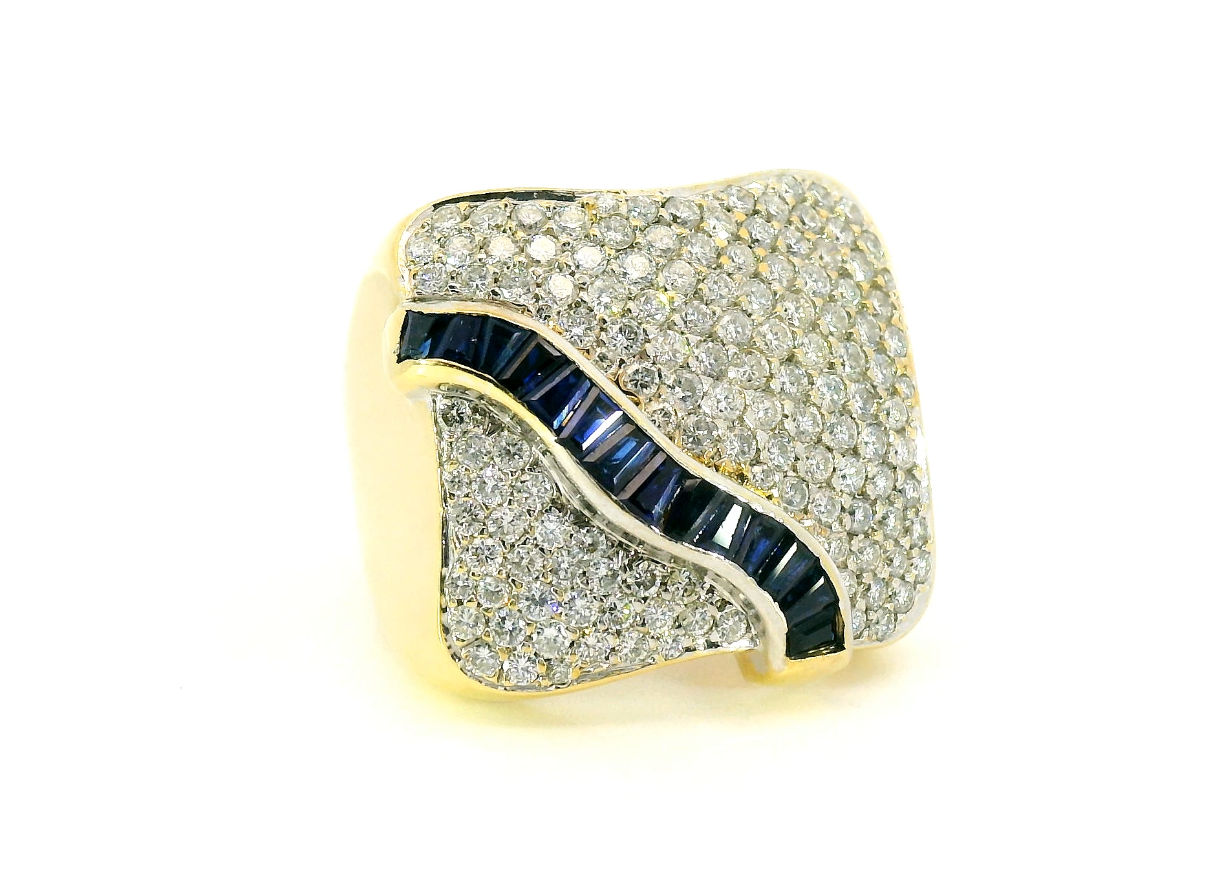 Золотое кольцо с сапфирами 0.75ct и бриллиантами 1.96ct — настоящее произведение искусства, в котором воплощено не только мастерство ювелира, но и актуальные тренды. Это доказательство вашего изысканного вкуса, высокого статуса и яркий акцент в стильном образе. Вставка — 14 сапфиров трапециевидной огранки 0.75ct 4/3-5/3, 130 бриллиантов круглой огранки 1.96ct 3/4-3/6, а обрамлением служит золото 750 пробы. Такое сочетание отлично смотрится и позволяет реализовывать самые необычные задумки вашего стиля. Размер ювелирного изделия — 17.5, бесплатно изменим на любой от 16.5 до 18.5, а общий вес — 17.58 г, и на пальце оно выглядит просто шикарно, сразу привлекая восхищенное внимание.