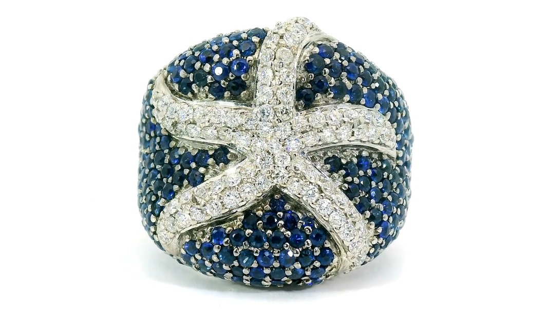 Золотое кольцо с сапфирами 2.97ct и бриллиантами 0.79ct — настоящее произведение искусства, в котором воплощено не только мастерство ювелира, но и актуальные тренды. Это доказательство вашего изысканного вкуса, высокого статуса и яркий акцент в стильном образе. Вставка — 198 сапфиров круглой огранки 2.97ct 3/2-5/3, 79 бриллиантов круглой огранки 0.79ct 3/4-3/5, а обрамлением служит золото 585 пробы. Такое сочетание отлично смотрится и позволяет реализовывать самые необычные задумки вашего стиля. Размер ювелирного изделия — 17.25, бесплатно изменим на любой от 15.25 до 18.25, а общий вес — 14.43 г, и на пальце оно выглядит просто шикарно, сразу привлекая восхищенное внимание.