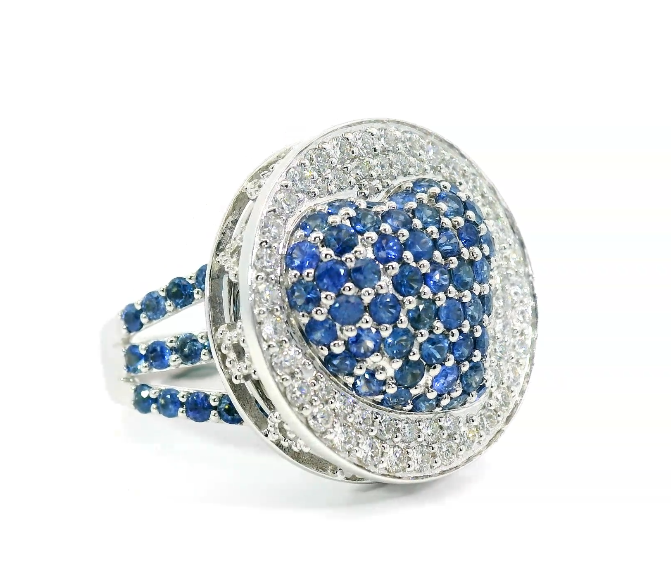Золотое кольцо с сапфирами 3.30ct и бриллиантами 0.63ct — настоящее произведение искусства, в котором воплощено не только мастерство ювелира, но и актуальные тренды. Это доказательство вашего изысканного вкуса, высокого статуса и яркий акцент в стильном образе. Вставка — 94 сапфира круглой огранки 3.30ct 4/2-5/3, 56 бриллиантов круглой огранки 0.63ct 3/4-4/5, а обрамлением служит золото 750 пробы. Такое сочетание отлично смотрится и позволяет реализовывать самые необычные задумки вашего стиля. Размер ювелирного изделия — 17.5, бесплатно изменим на любой от 16.5 до 18.5, а общий вес — 15.58 г, и на пальце оно выглядит просто шикарно, сразу привлекая восхищенное внимание.