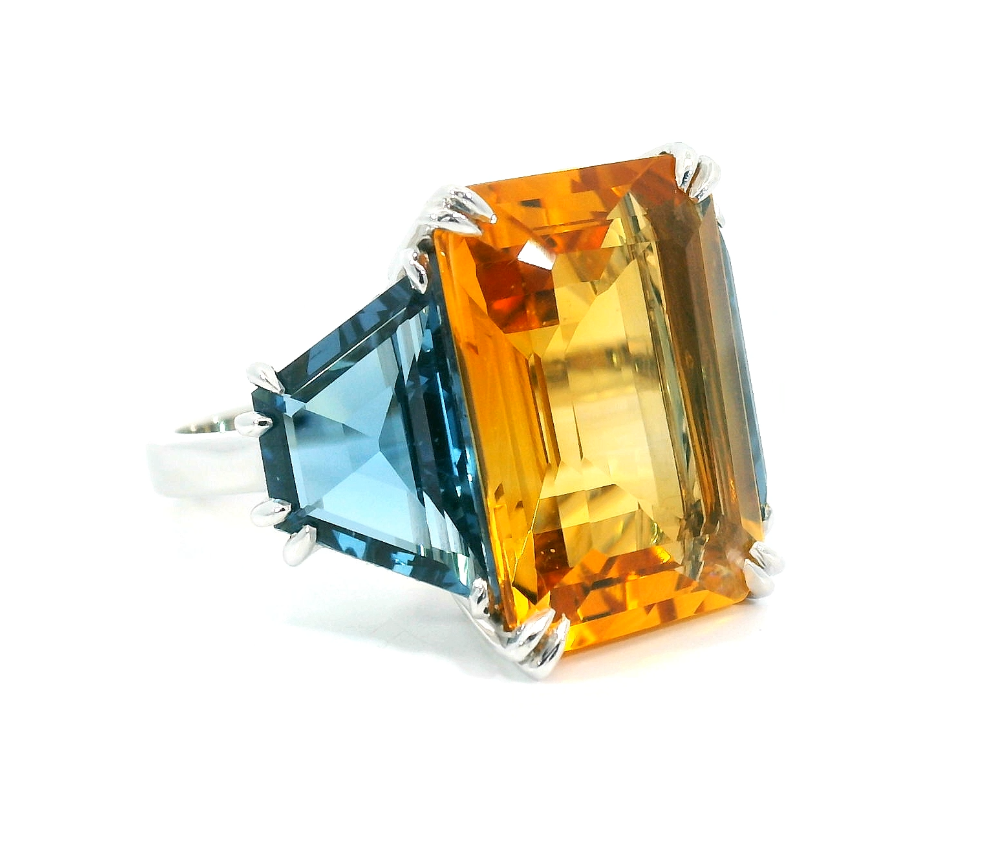 Золотое кольцо с цитрином 13.28ct и топазами 6.97ct Evgeny Matveev — настоящее произведение искусства, в котором воплощено не только мастерство ювелира, но и актуальные тренды. Это доказательство вашего изысканного вкуса, высокого статуса и яркий акцент в стильном образе. Вставка — 1 цитрин огранки "октагон" 13.28ct, 2 топаза "London Blue" огранки "триллиант" 6.97ct, 1 турмалин параиба круглой огранки 0.02ct, 28 бриллиантов круглой огранки 0.20ct 3/4-3/5, а обрамлением служит золото 750 пробы. Такое сочетание отлично смотрится и позволяет реализовывать самые необычные задумки вашего стиля. Размер ювелирного изделия — 18, а общий вес — 10.79 г, и на пальце оно выглядит просто шикарно, сразу привлекая восхищенное внимание.