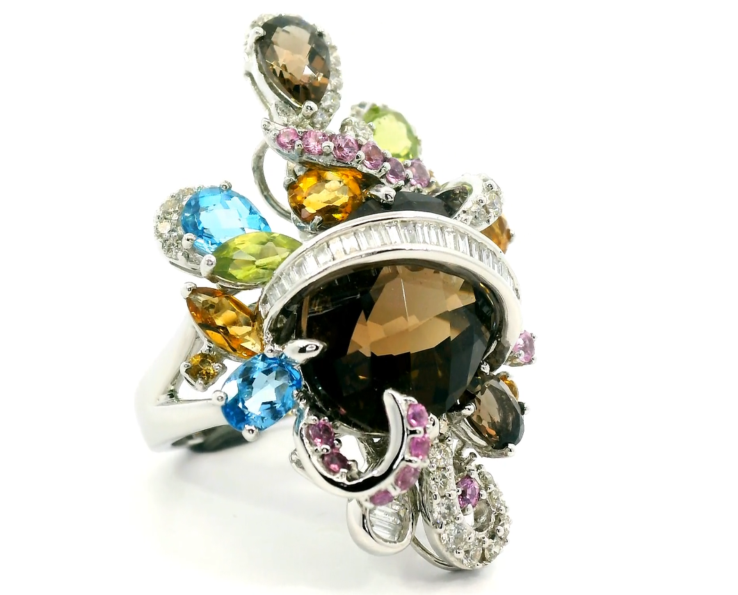 Золотое кольцо с цветными камнями 11.26ct — настоящее произведение искусства, в котором воплощено не только мастерство ювелира, но и актуальные тренды. Это доказательство вашего изысканного вкуса, высокого статуса и яркий акцент в стильном образе. Вставка — 1 дымчатый кварц овальной огранки 8.20ct, 1 дымчатый кварц огранки "октагон" 0.40ct, 1 дымчатый кварц огранки "груша" 0.50ct , 2 цитрина овальной огранки 0.65ct, 1 цитрин огранки "маркиз" 0.20ct, 3 цитрина круглой огранки 0.07ct, 1 хризолит огранки "груша" 0.60ct, 1 хризолит огранки "маркиз" 0.23ct, 14 розовых сапфиров круглой огранки 0.41ct, 36 бриллиантов круглой огранки 0.46ct 4/4-4/5, 30 бриллиантов огранки "прямоугольный багет" 0.38ct 3/4-3/5, а обрамлением служит золото 750 пробы. Такое сочетание отлично смотрится и позволяет реализовывать самые необычные задумки вашего стиля. Размер ювелирного изделия — 17.5, бесплатно изменим на любой от 16.5 до 18.5, а общий вес — 18.44 г, и на пальце оно выглядит просто шикарно, сразу привлекая восхищенное внимание.