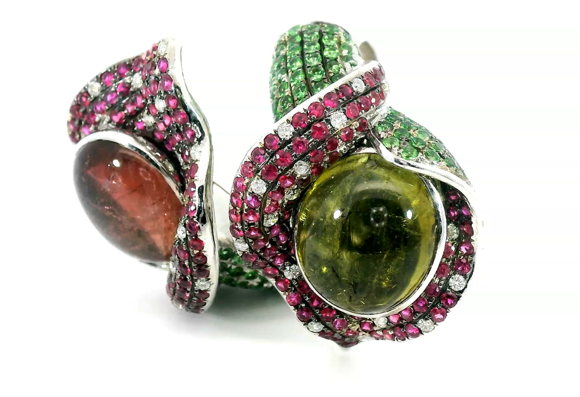 Золотое кольцо с цветными камнями 16.35ct и бриллиантами 0.45ct — настоящее произведение искусства, в котором воплощено не только мастерство ювелира, но и актуальные тренды. Это доказательство вашего изысканного вкуса, высокого статуса и яркий акцент в стильном образе. Вставка — 2 турмалина огранки "овальный кабошон2 12.80ct, 101 тсаворит круглой огранки 1.25ct, 182 рубина круглой огранки 2.30ct 3/2-4/3, 39 бриллиантов круглой огранки 0.45ct 3/4-4/6, а обрамлением служит золото 750 пробы. Такое сочетание отлично смотрится и позволяет реализовывать самые необычные задумки вашего стиля. Размер ювелирного изделия — 18.5, бесплатно изменим на любой от 18 до 19, а общий вес — 26.58 г, и на пальце оно выглядит просто шикарно, сразу привлекая восхищенное внимание.