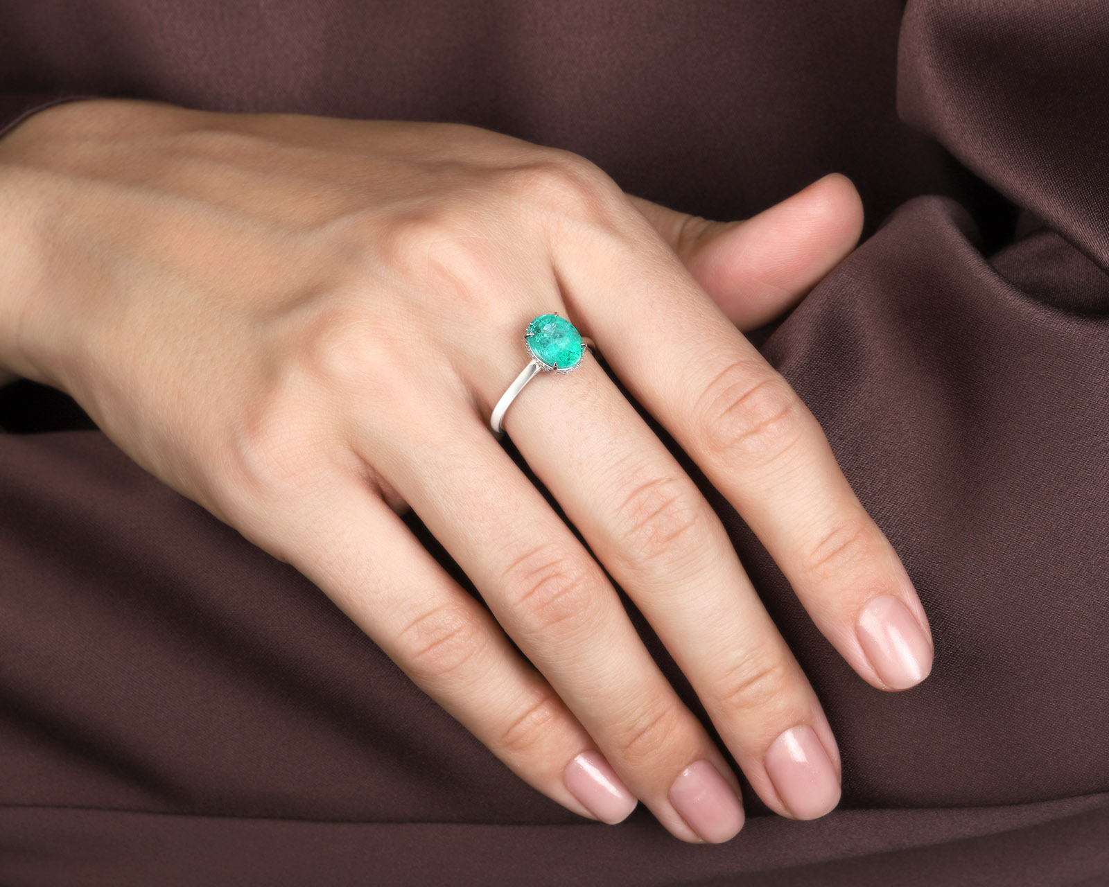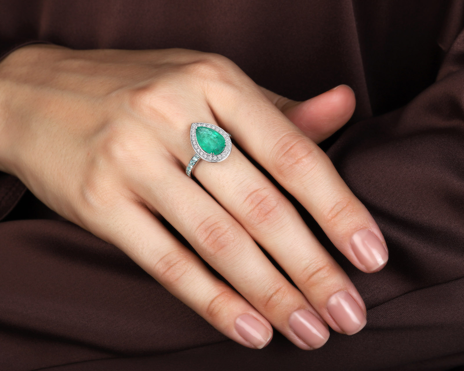 Золотое кольцо с турмалинами параиба 0.65ct Evgeny Matveev — настоящее произведение искусства, в котором воплощено не только мастерство ювелира, но и актуальные тренды. Это доказательство вашего изысканного вкуса, высокого статуса и яркий акцент в стильном образе. Вставка — 1 турмалин параиба овальной огранки 0.64ct Bellerophon B33538, 10 бриллиантов круглой огранки 0.39ct 3/4-3/5, 1 турмалин параиба круглой огранки 0.01ct, а обрамлением служит золото 750 пробы. Такое сочетание отлично смотрится и позволяет реализовывать самые необычные задумки вашего стиля. Размер ювелирного изделия — 17, бесплатно изменим на любой от 16.5 до 17.5, а общий вес — 3.83 г, и на пальце оно выглядит просто шикарно, сразу привлекая восхищенное внимание.