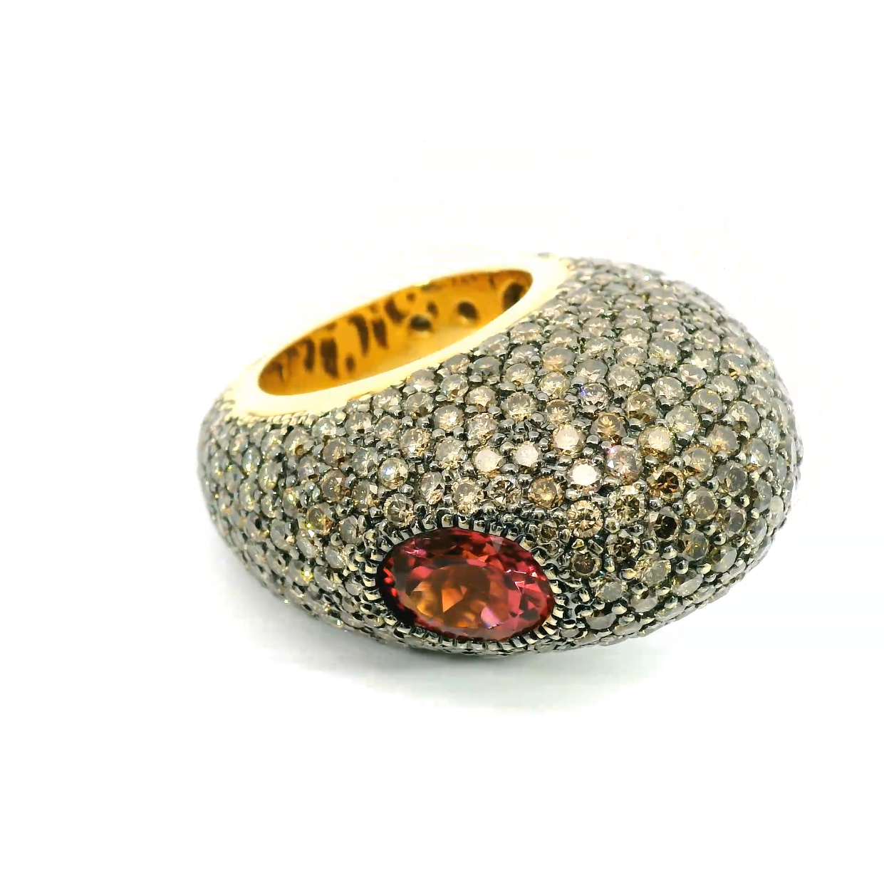 Золотое кольцо с турмалином 2.50ct и бриллиантами 14.50ct — настоящее произведение искусства, в котором воплощено не только мастерство ювелира, но и актуальные тренды. Это доказательство вашего изысканного вкуса, высокого статуса и яркий акцент в стильном образе. Вставка — 1 турмалин овальной огранки 2.50ct, 469 бриллиантов круглой огранки 14.50ct 7/5-7/7, а обрамлением служит золото 750 пробы. Такое сочетание отлично смотрится и позволяет реализовывать самые необычные задумки вашего стиля. Размер ювелирного изделия — 18, бесплатно изменим на любой от 16 до 17.75, а общий вес — 45.71 г, и на пальце оно выглядит просто шикарно, сразу привлекая восхищенное внимание.