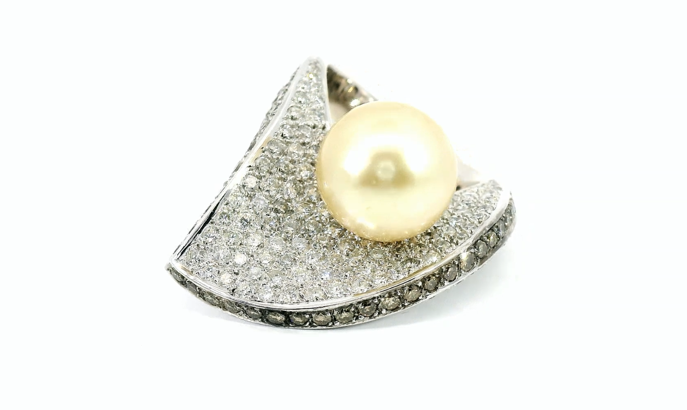Золотое кольцо с жемчугом 11.65 мм и бриллиантами 2.34ct — настоящее произведение искусства, в котором воплощено не только мастерство ювелира, но и актуальные тренды. Это доказательство вашего изысканного вкуса, высокого статуса и яркий акцент в стильном образе. Вставка — 1 жемчуг 11.65 мм, 144 бриллианта круглой огранки 1.70ct 4/6-5/7, 42 бриллианта круглой огранки 0.64ct 7/6, а обрамлением служит золото 750 пробы. Такое сочетание отлично смотрится и позволяет реализовывать самые необычные задумки вашего стиля. Размер ювелирного изделия — 17.5, бесплатно изменим на любой от 15.5 до 18.5, а общий вес — 19.84 г, и на пальце оно выглядит просто шикарно, сразу привлекая восхищенное внимание.